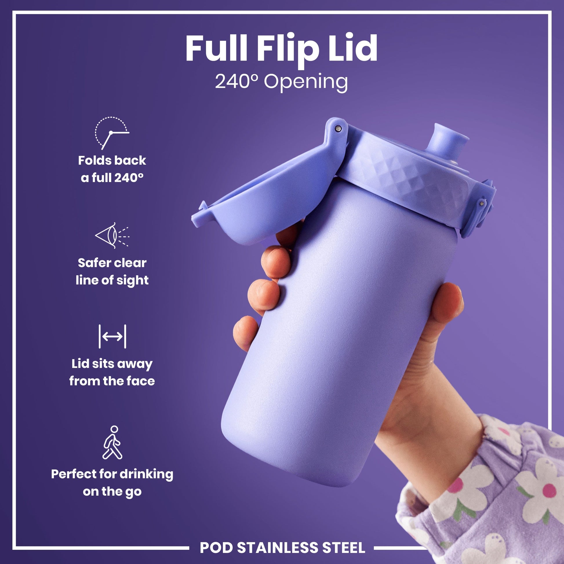 100% leak proof 400ml / 13oz stainless steel water bottles with a smooth flow for spill-free hydration and hygienic full-flip top cover for one handed use on-the-go.