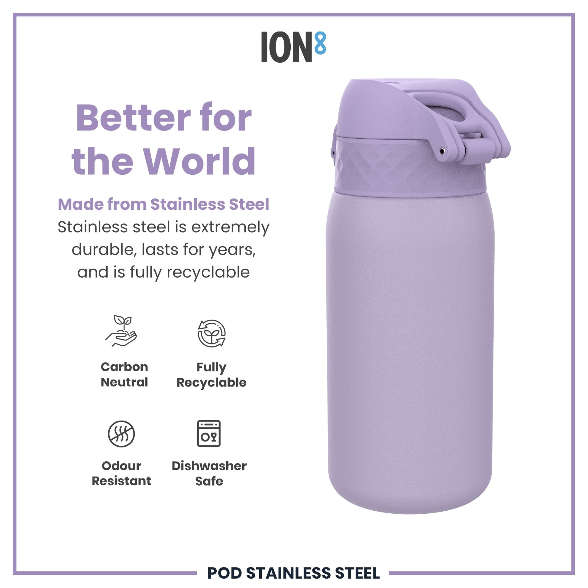 Made from lightweight stainless steel. Stainless steel is extremely durable, lasts for years, and is fully recyclable. This refillable and reusable purple water bottle is food safe, odour resistant, easy to hand wash, and keeps drinks fresh and full of flavour.