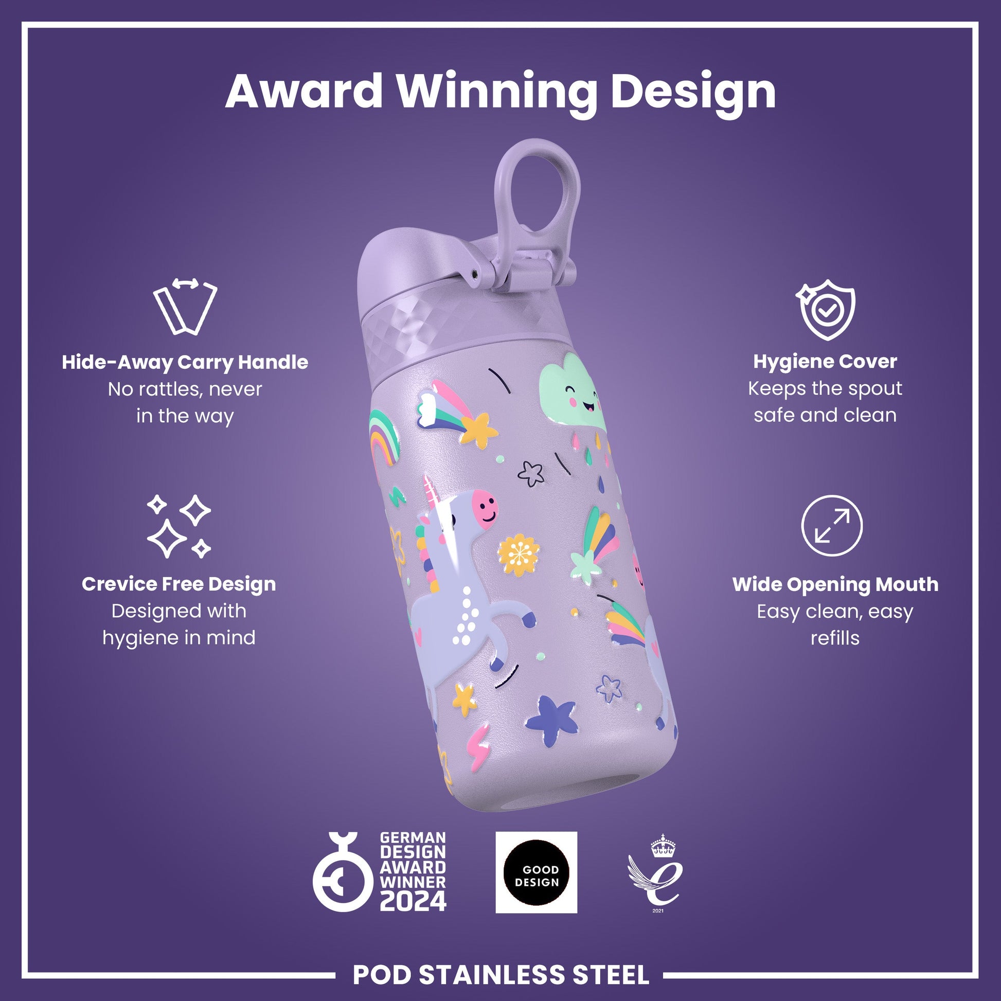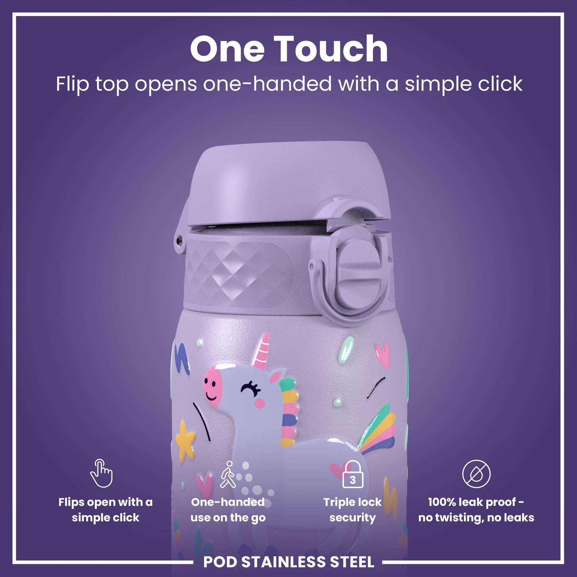 100% leak proof 400ml / 13oz stainless steel unicorn water bottle with a smooth flow for spill-free hydration and hygienic full-flip top cover for one handed use on-the-go.