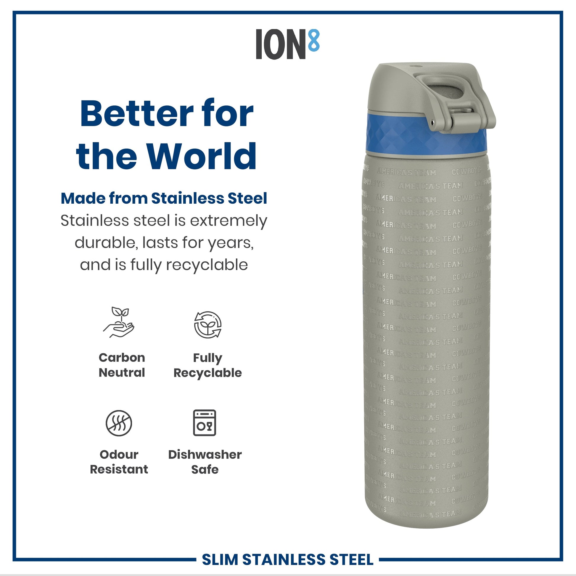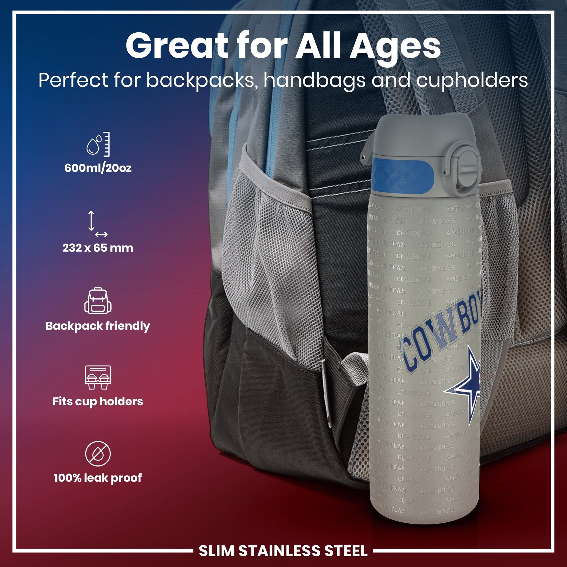 Leak Proof NFL Water Bottle, Stainless Steel, Dallas Cowboys, 600ml (20oz)