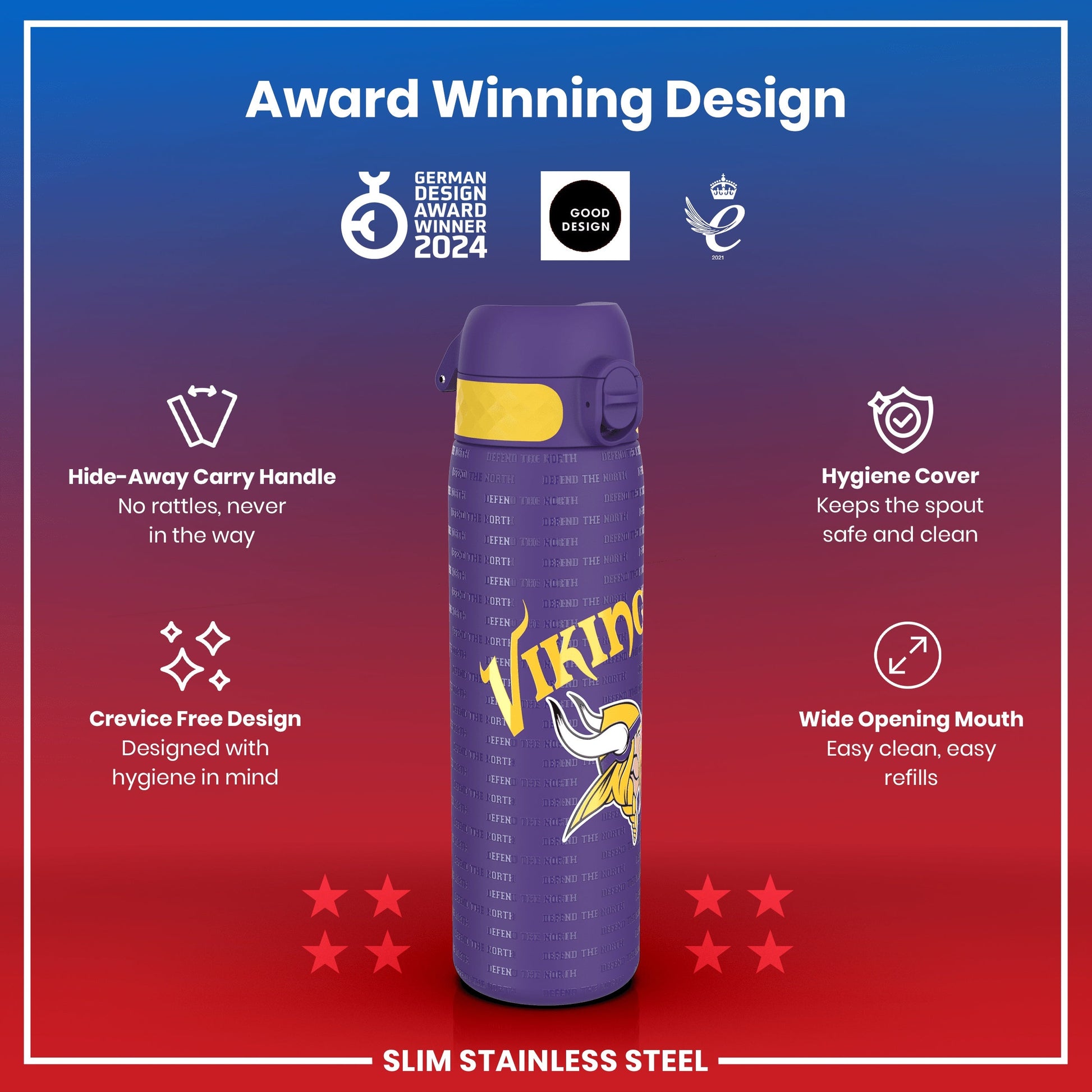 Leak Proof NFL Water Bottle, Stainless Steel, Minnesota Vikings, 600ml (20oz)