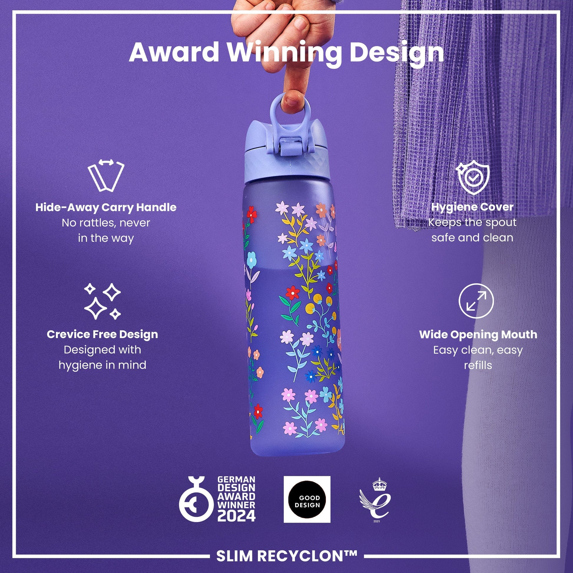 Leak Proof Slim Water Bottle, Recyclon, Ditsy Floral, 500ml (18oz)