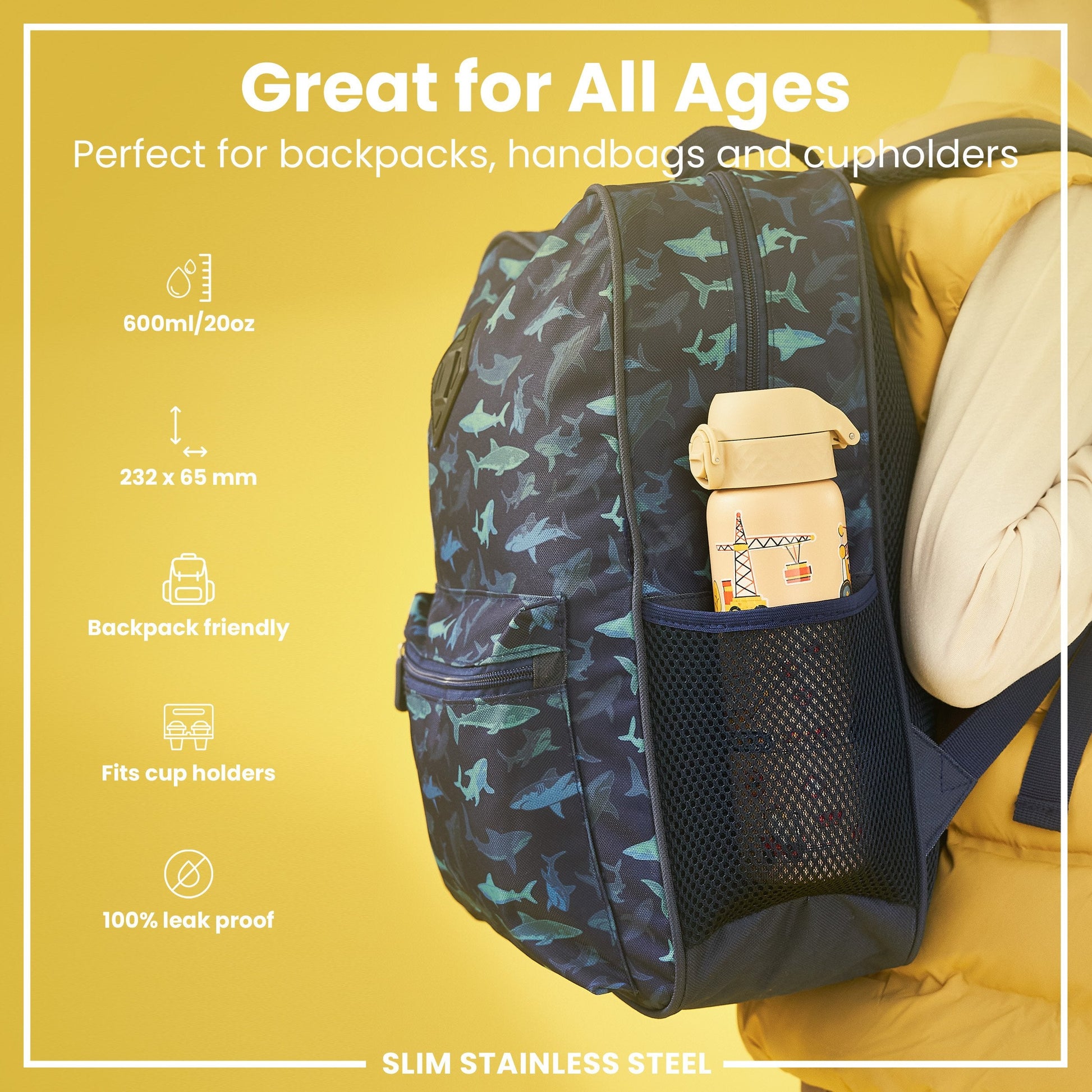 The perfect replacement for single use disposable cups. Small enough as a kids water bottle for their school lunch boxes or for smaller bags about town. The width of a soda can, it fits perfectly into all car cup holders and pockets on all backpacks.