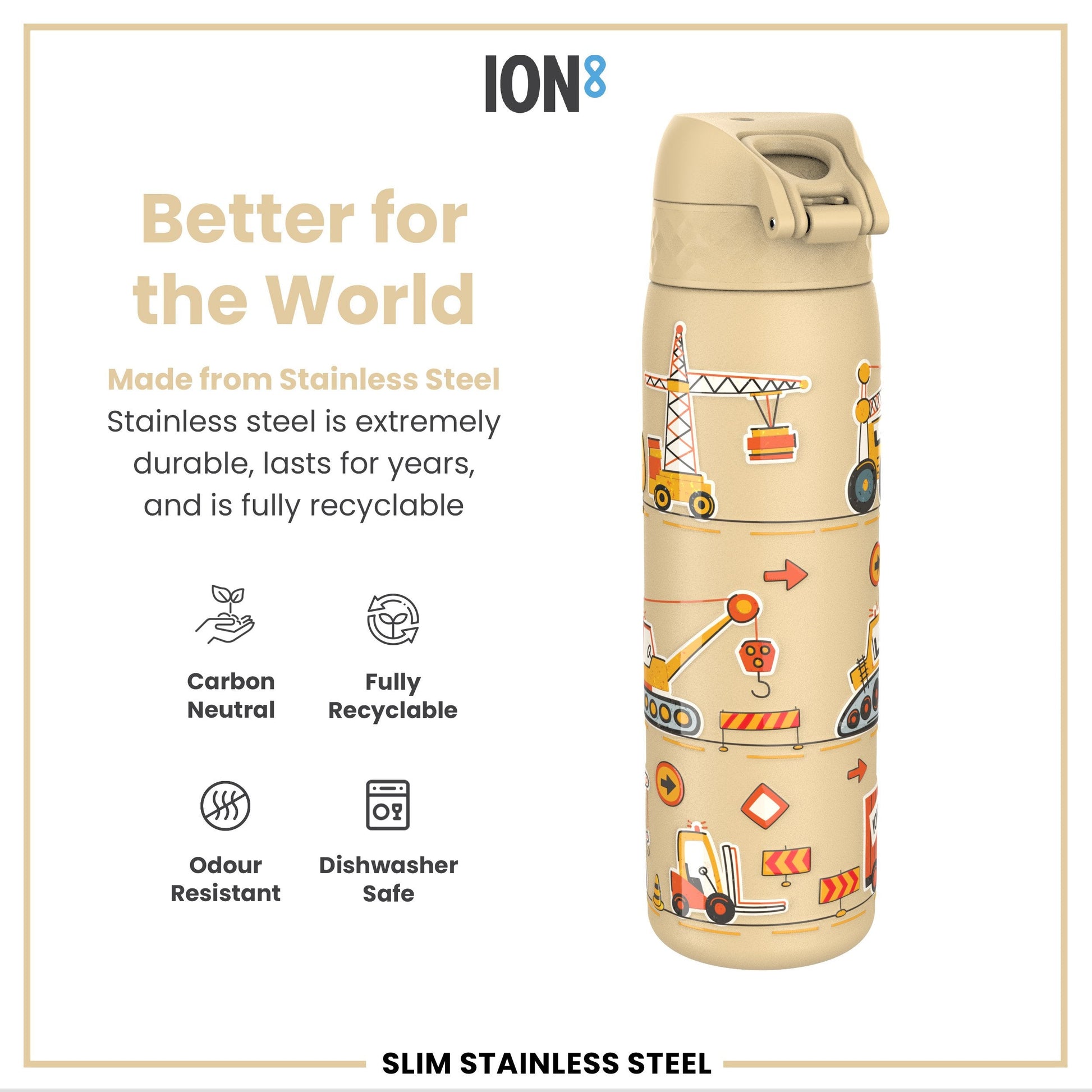 Leak Proof Slim Water Bottle, Stainless Steel, Diggers, 600ml (20oz)