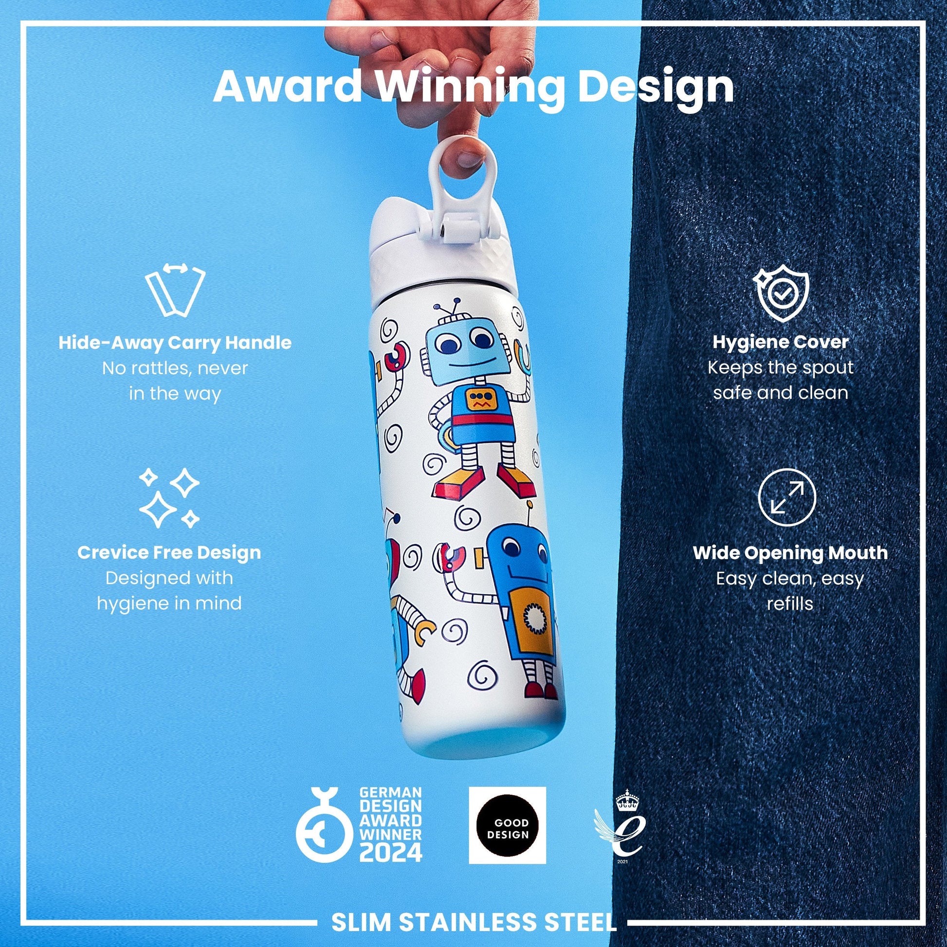 Leak Proof Slim Water Bottle, Stainless Steel, Robots, 600ml (20oz)