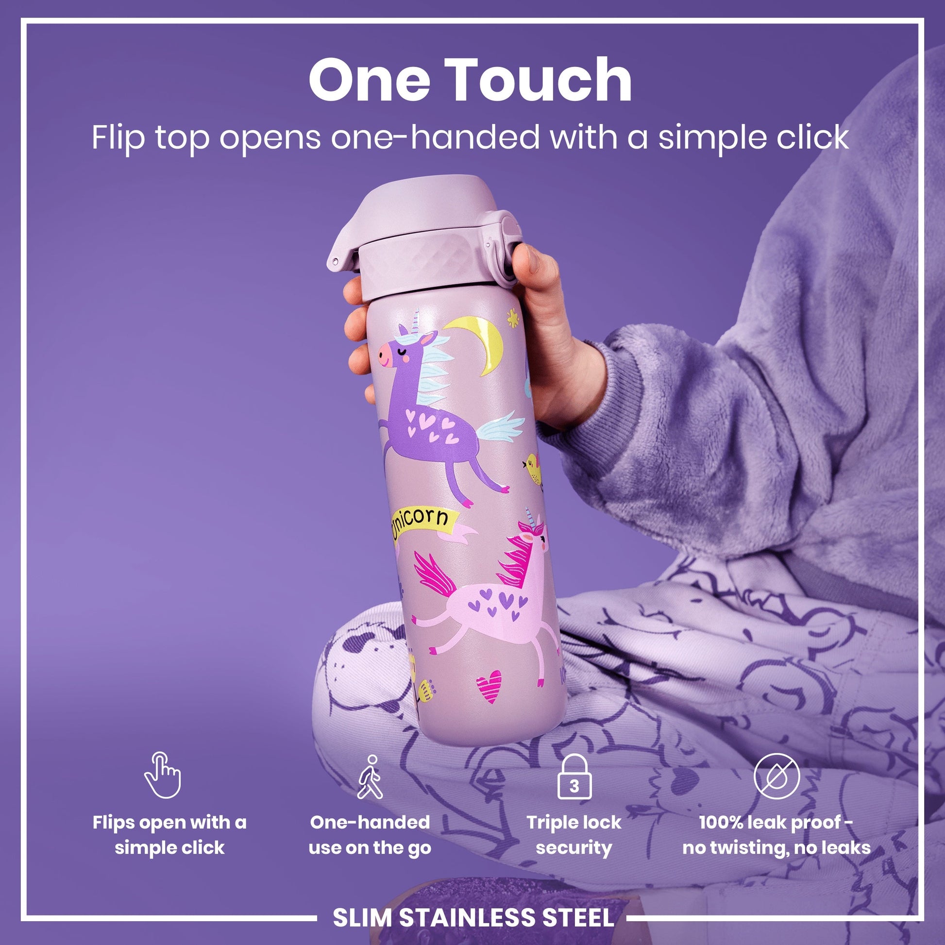 100% leak proof 600ml / 20oz stainless steel unicorn water bottle with a smooth flow for spill-free hydration and hygienic full-flip top cover for one handed use on-the-go.