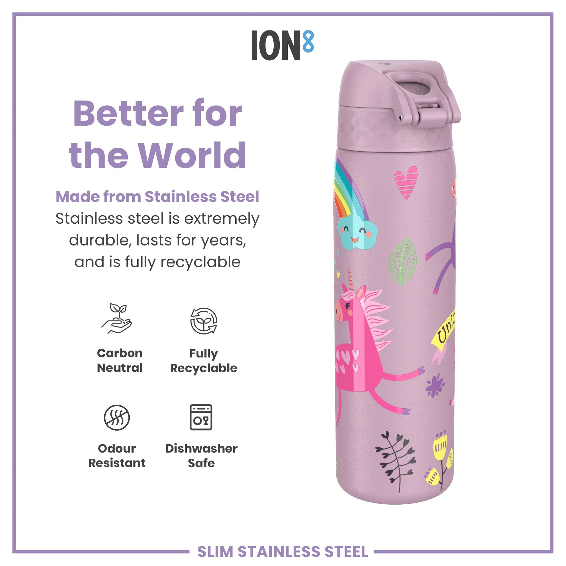 Made from lightweight stainless steel. Stainless steel is extremely durable, lasts for years, and is fully recyclable. This refillable and reusable purple water bottle is food safe, odour resistant, easy to hand wash, and keeps drinks fresh and full of flavour.