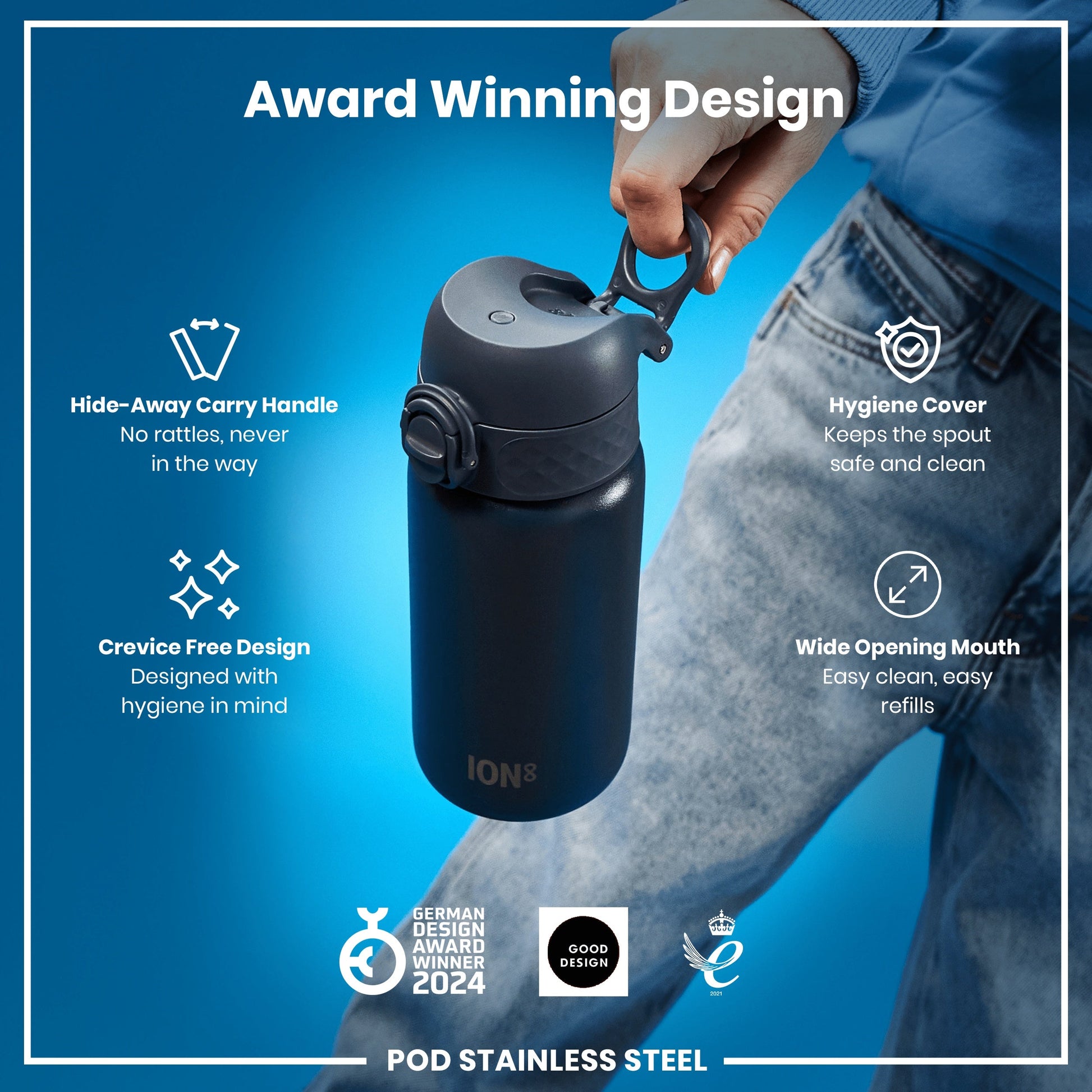 100% leak proof 400ml / 13oz stainless steel blue water bottle with a smooth flow for spill-free hydration and hygienic full-flip top cover for one handed use on-the-go.