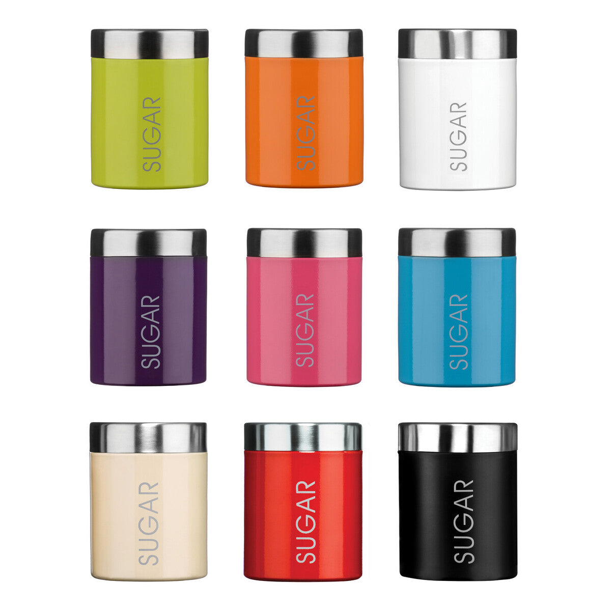 This sugar canister is a minimalist piece of kitchen storage, featuring a matte black enamel body for a modern, understated look. The word "SUGAR" is subtle and vertically printed on the side, capped by a bright, polished stainless steel lid, creating a striking contrast between the two finishes.