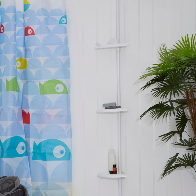 Style it with matching bottles and baskets for a tidy, curated look. The white finish suits light tiles and neutral palettes, and it also brightens darker bathrooms by keeping the corner area feeling clean and modern.