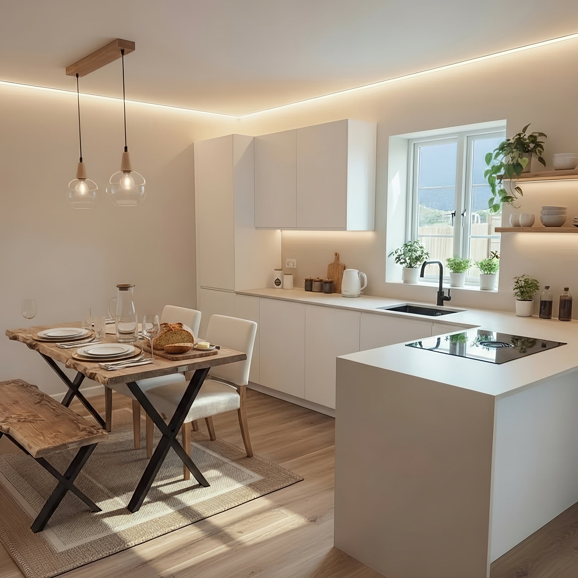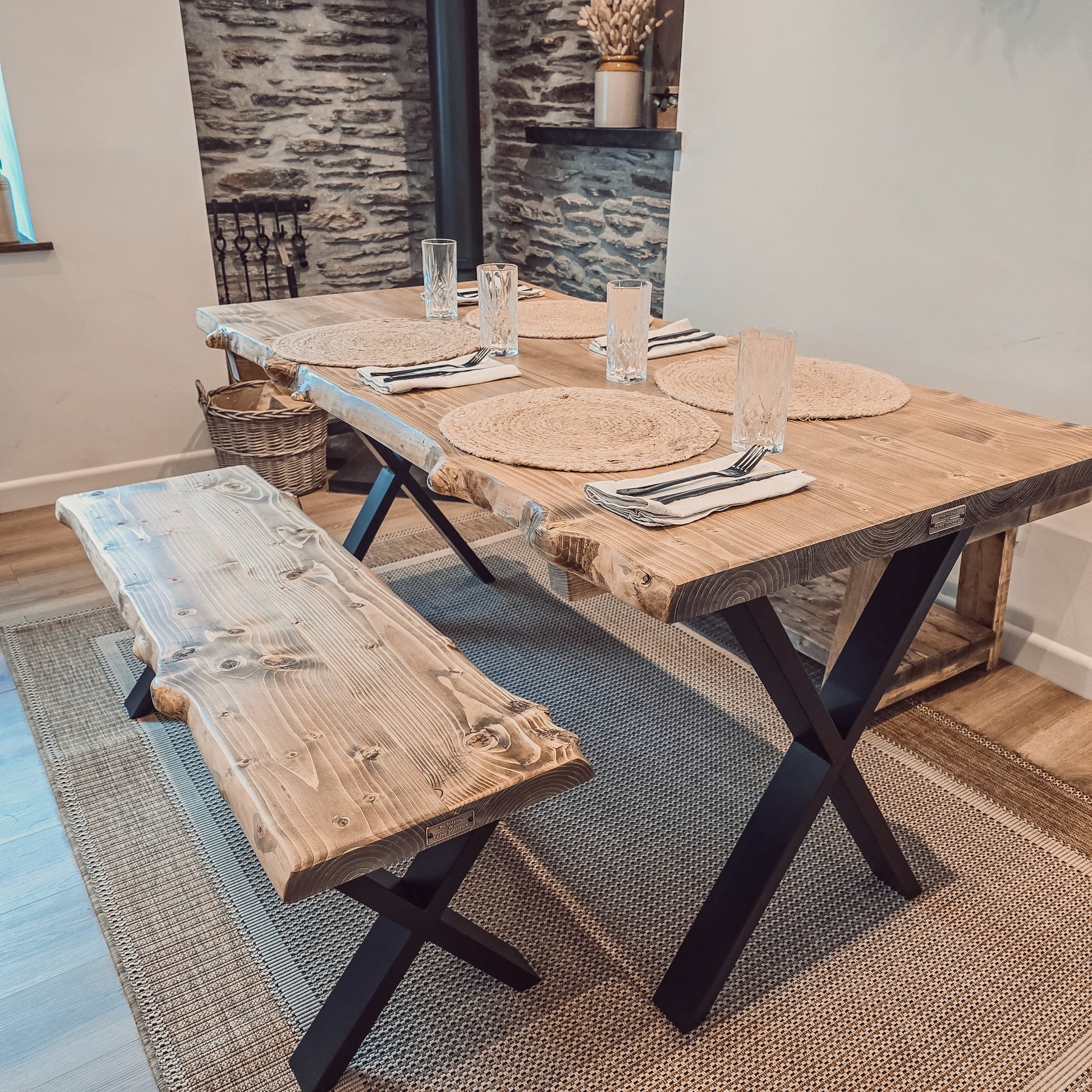 Live / Waney Edge Dining Table With Bench and X Cross Metal Legs