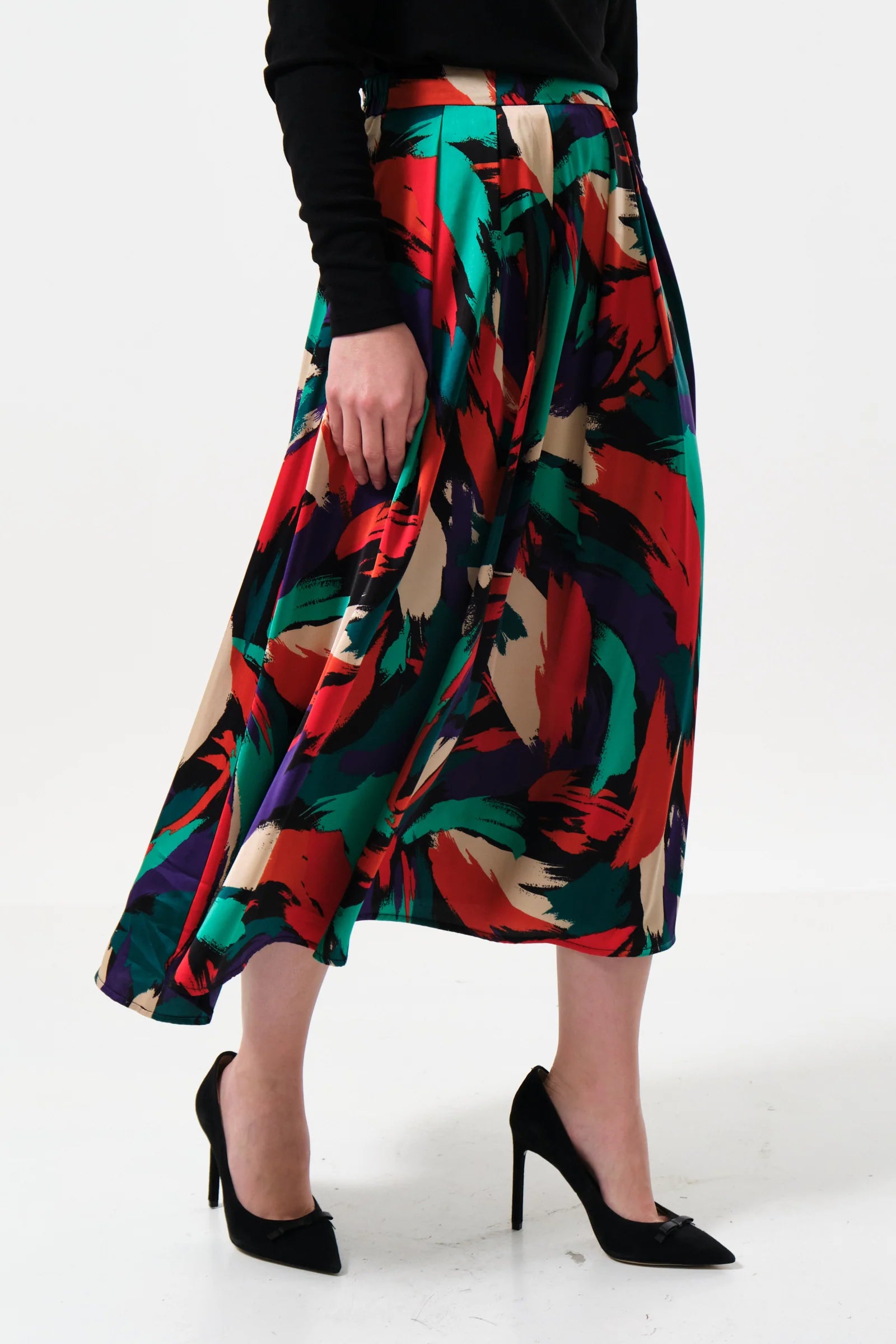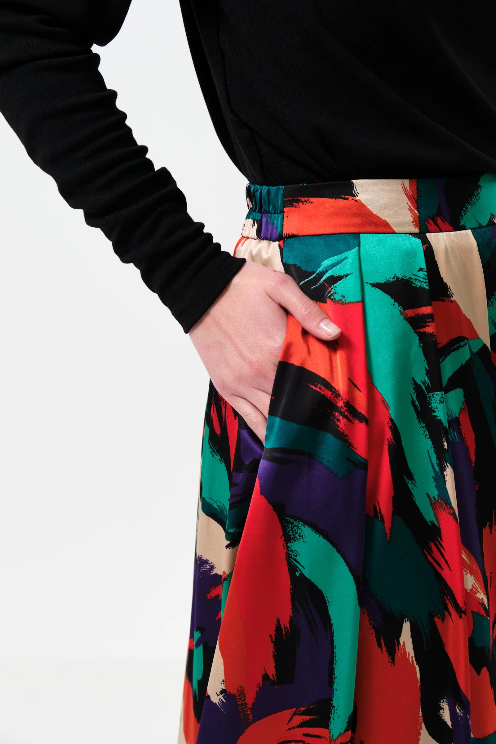 Elevate your wardrobe with our Lizea Hofmann print midi skirt. Crafted from luxurious matte satin, this dramatic abstract printed skirt adds a touch of elegance to any outfit. Perfect for pairing with a simple black tee, it effortlessly takes your style to the next level.