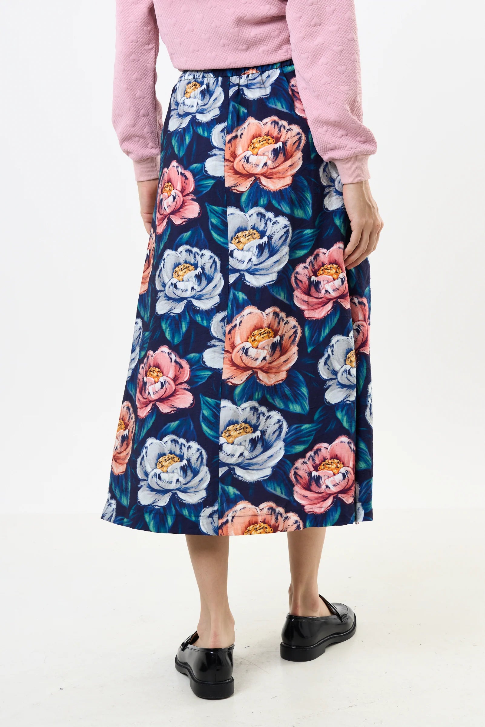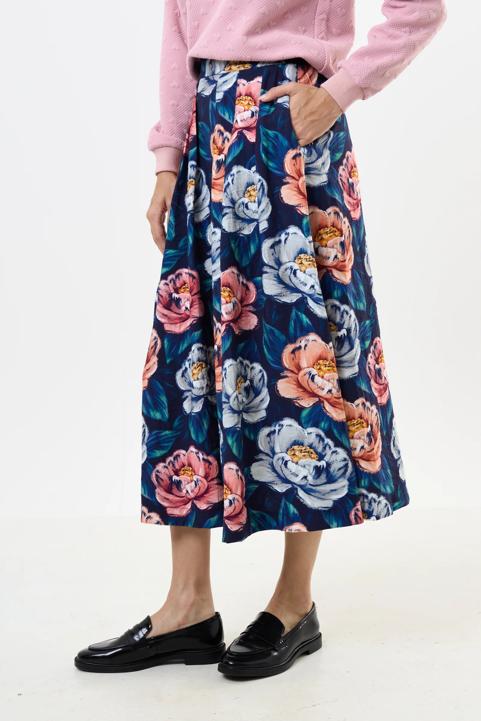 Lizea Peonies Print Pleated Midi Skirt - Navy