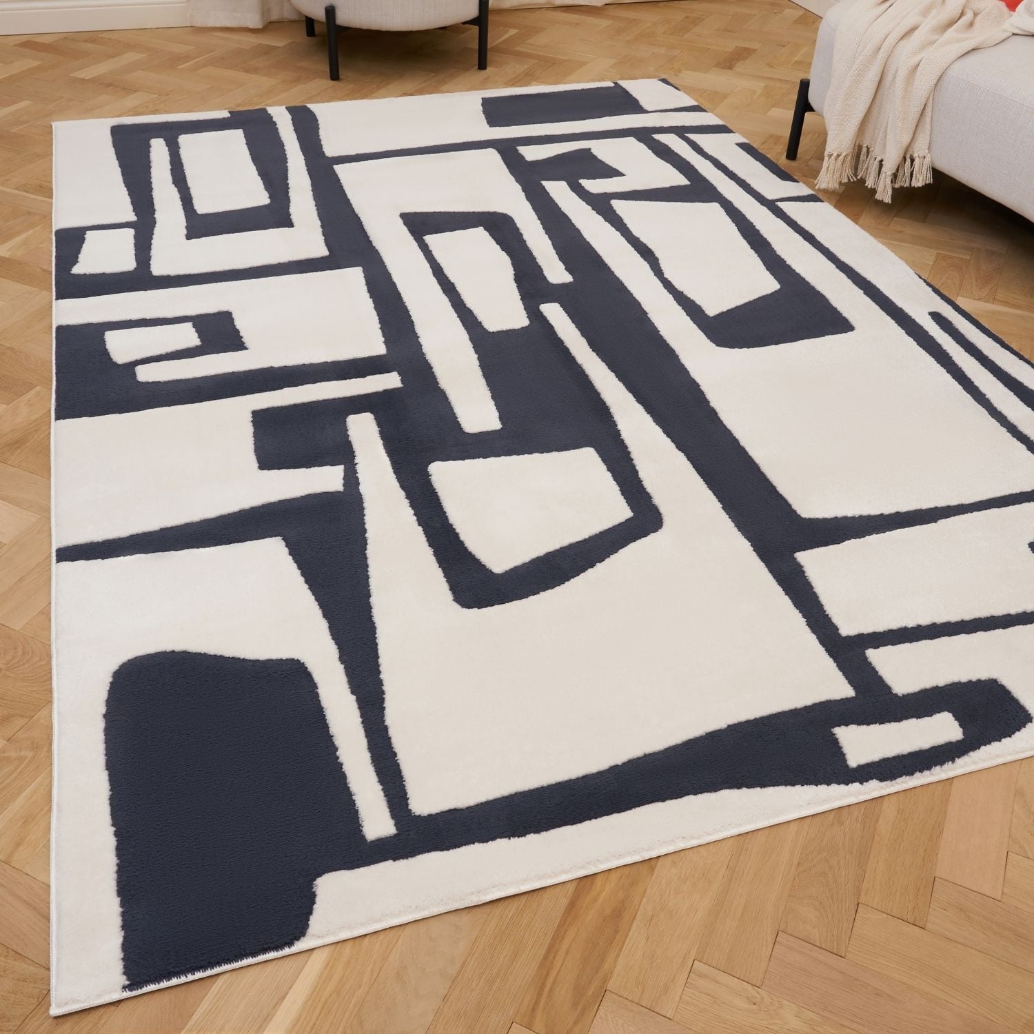 Its abstract geometric design features soft blue patterns on a light cream base, adding subtle visual interest without overwhelming the space. Organic lines and free-form shapes create a relaxed, modern feel, perfect for living rooms, bedrooms, or creative areas.
