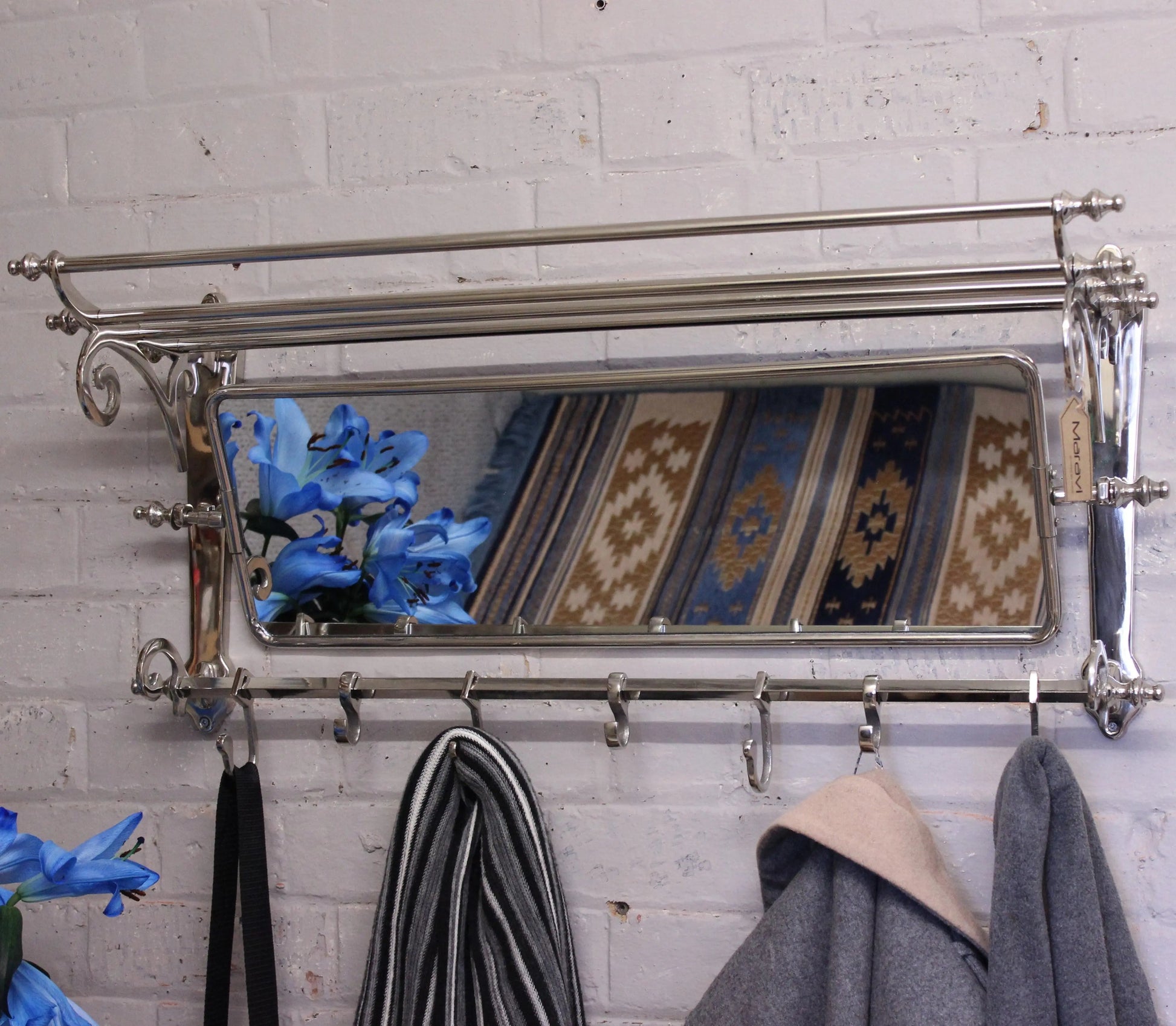 The Lohit Train Antique Luggage Rack with Mirror brings vintage elegance to your home. This coat rack, finished in antique nickel, evokes the grandeur of classic entrance cloakrooms. Its elegant shape and form make it a perfect addition to vestibules and hallways, providing both functionality and a touch of timeless style.