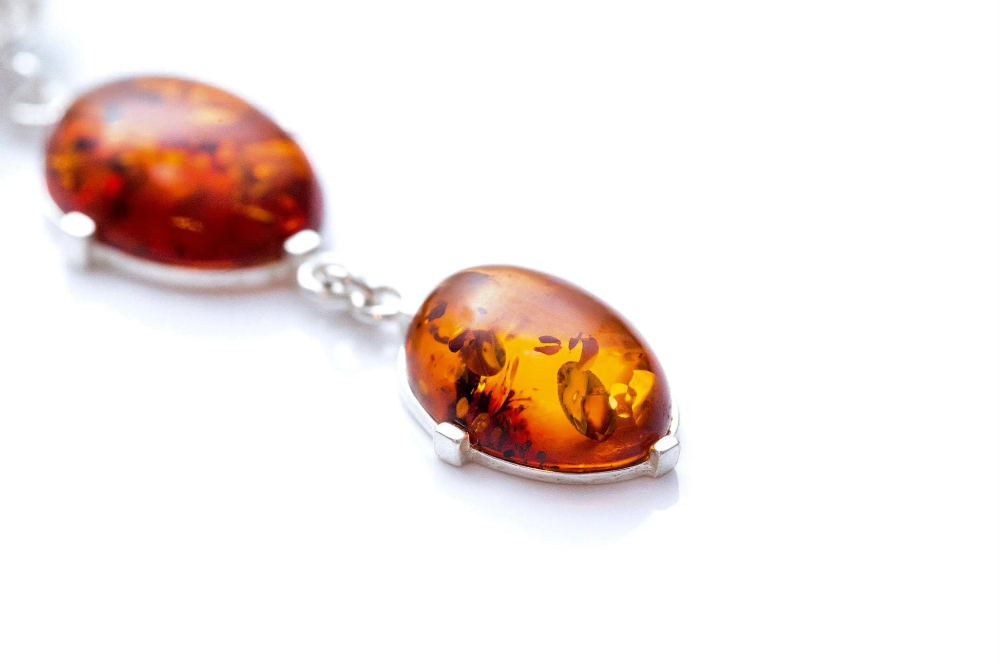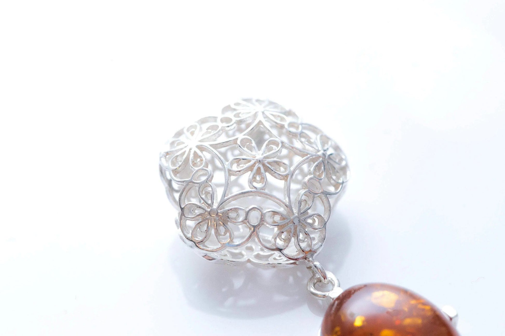 A decorative and elegant Amber Y Necklace. Featuring two Amber oval drops, suspended from a large filigree cage bale, decorated with openwork flowers.