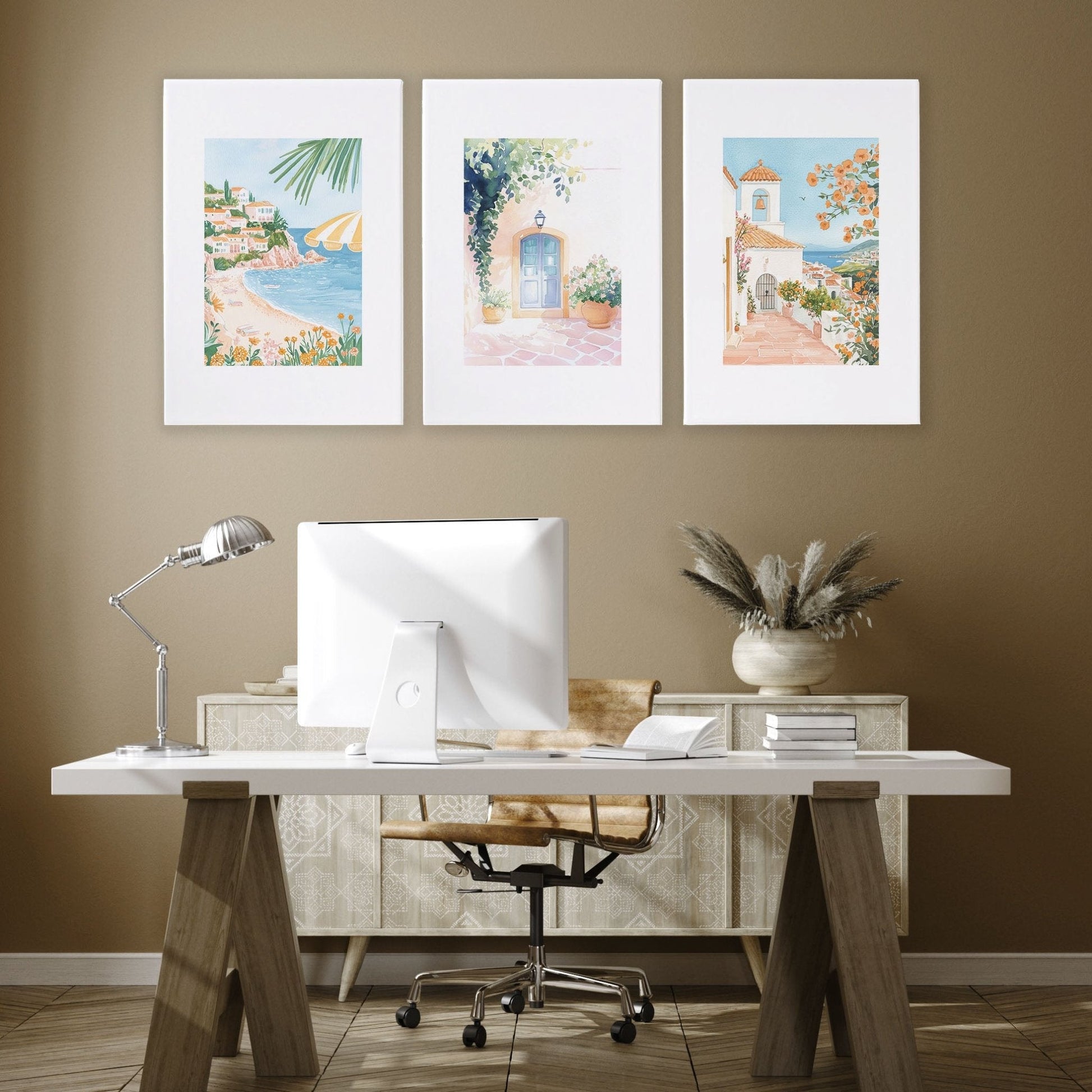 Transform your space with our stunning Long Rectangular Wall Decor. Discover the Set of 3 Beach Decor Wall Art Prints that's perfect for enhancing your office wall art. These prints harness the soothing vibes of the ocean with a pastel art colour palette that s oftens any environment, making your workspace a serene harbour of tranquillity. The beach decor style infuses a sense of relaxation and openness, making those long work hours feel a bit more like a seaside escape.