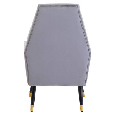 The Loretta chair is the perfect combination of sleek opulence and modern retro. Strong lines on the chair are contrasted by plush grey velvet upholstery and a three button detailing, which is supported by black wooden legs with a luxe gold tip.