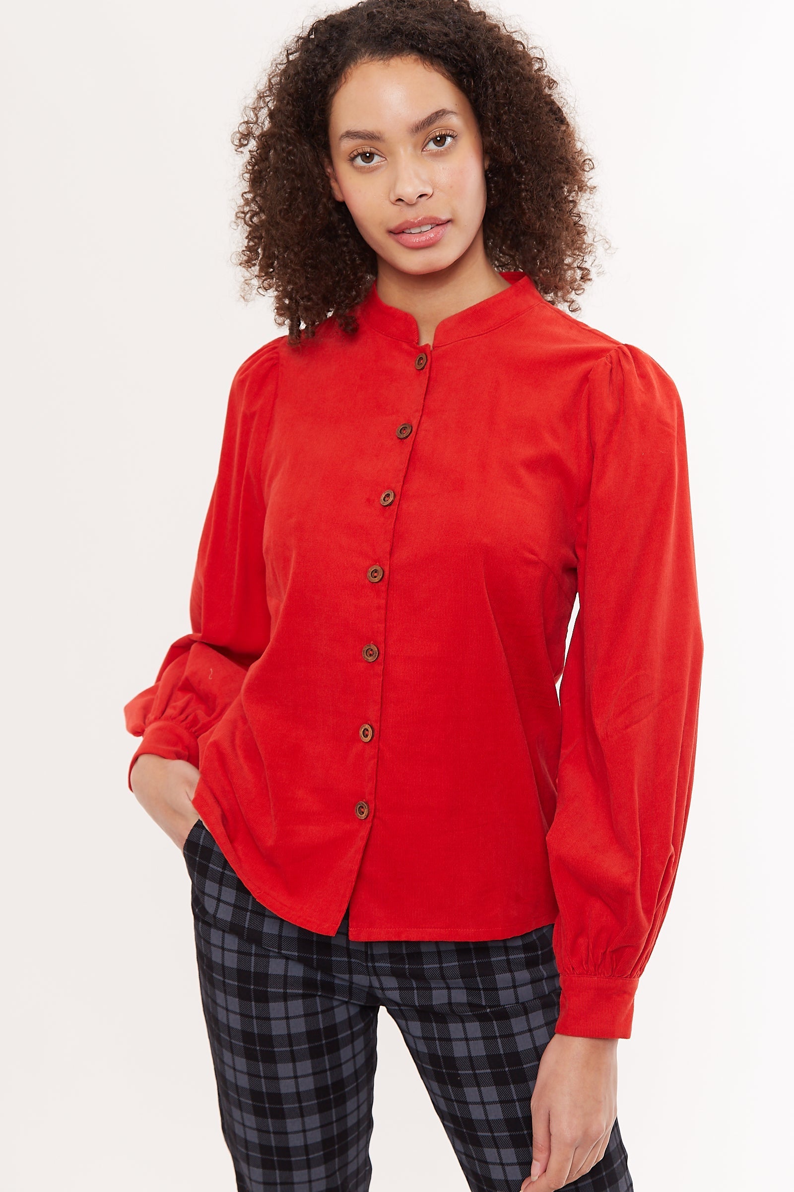 Stay warm and stylish in this Louche Aviv Baby Cord blouse! Made with super-soft cotton and featuring voluminous long sleeves, wooden buttons, and stand collar, it's the perfect pick to add a fun and quirky twist to your winter wardrobe. Don't miss out on this cosy baby cord number!
