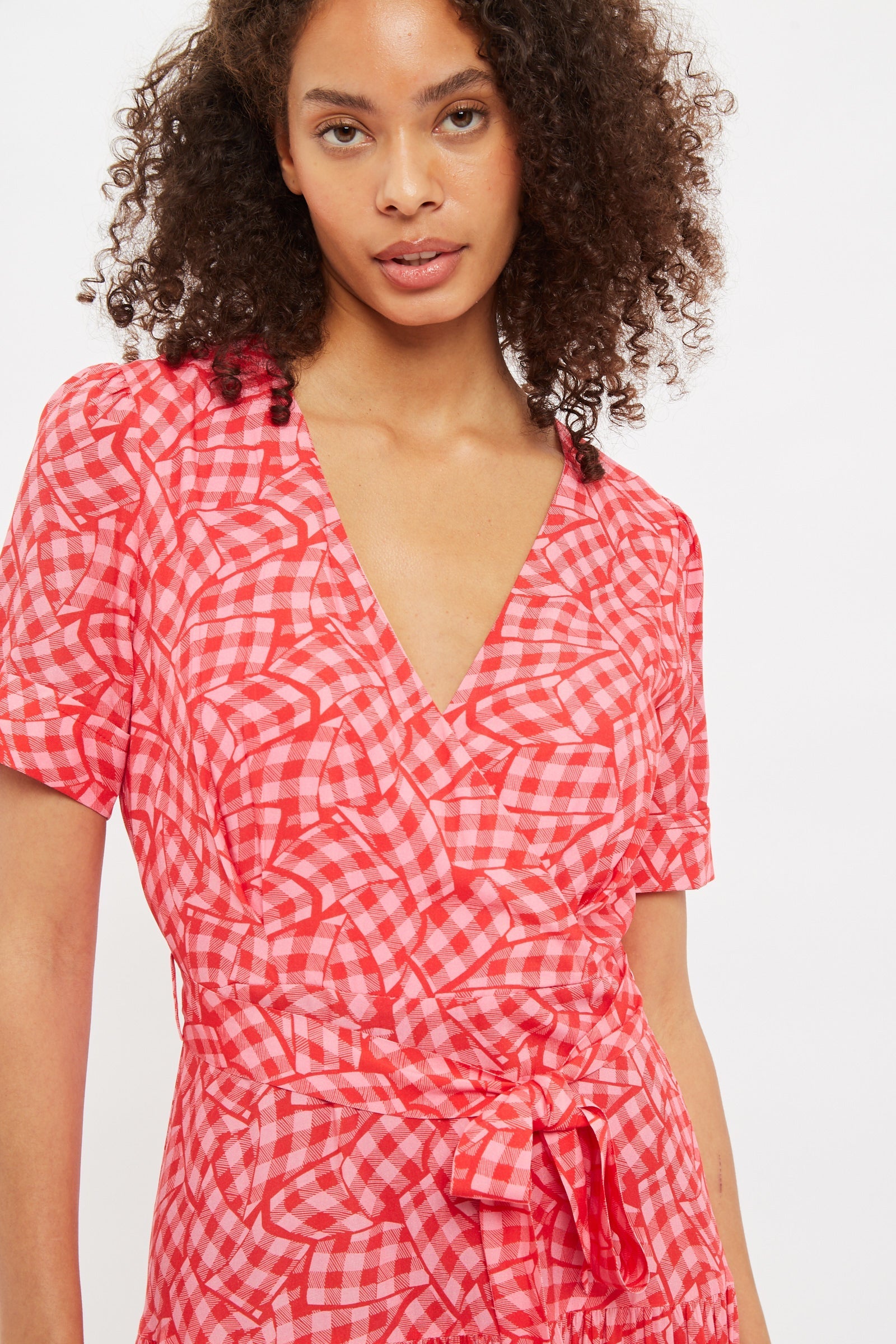 This flattering tiered midi dress, crafted in our modern take on the classic gingham style print. Takes you from work to weekend effortlessly. Featuring cuffed short sleeves. Wrap front bodice and self tie belt