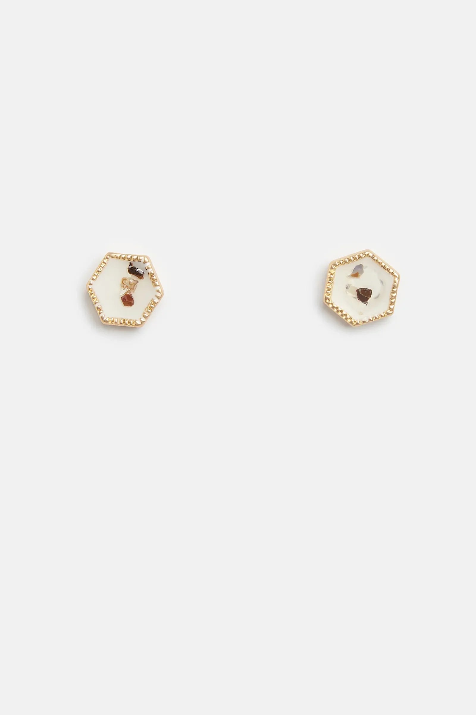 These versatile, eye catching hexagon stud earrings feature embedded gemstones encased in resin.