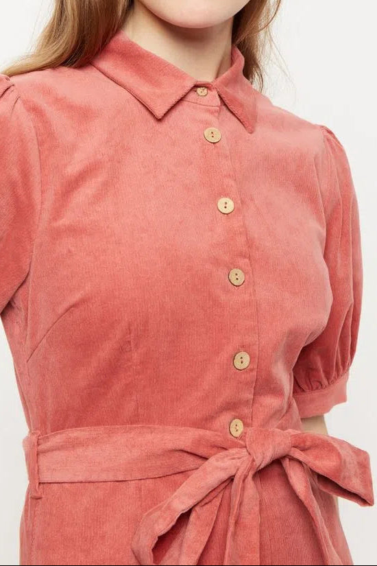Louche Mollie Baby Cord Puff Sleeve Midi Shirtdress Blush Pink
