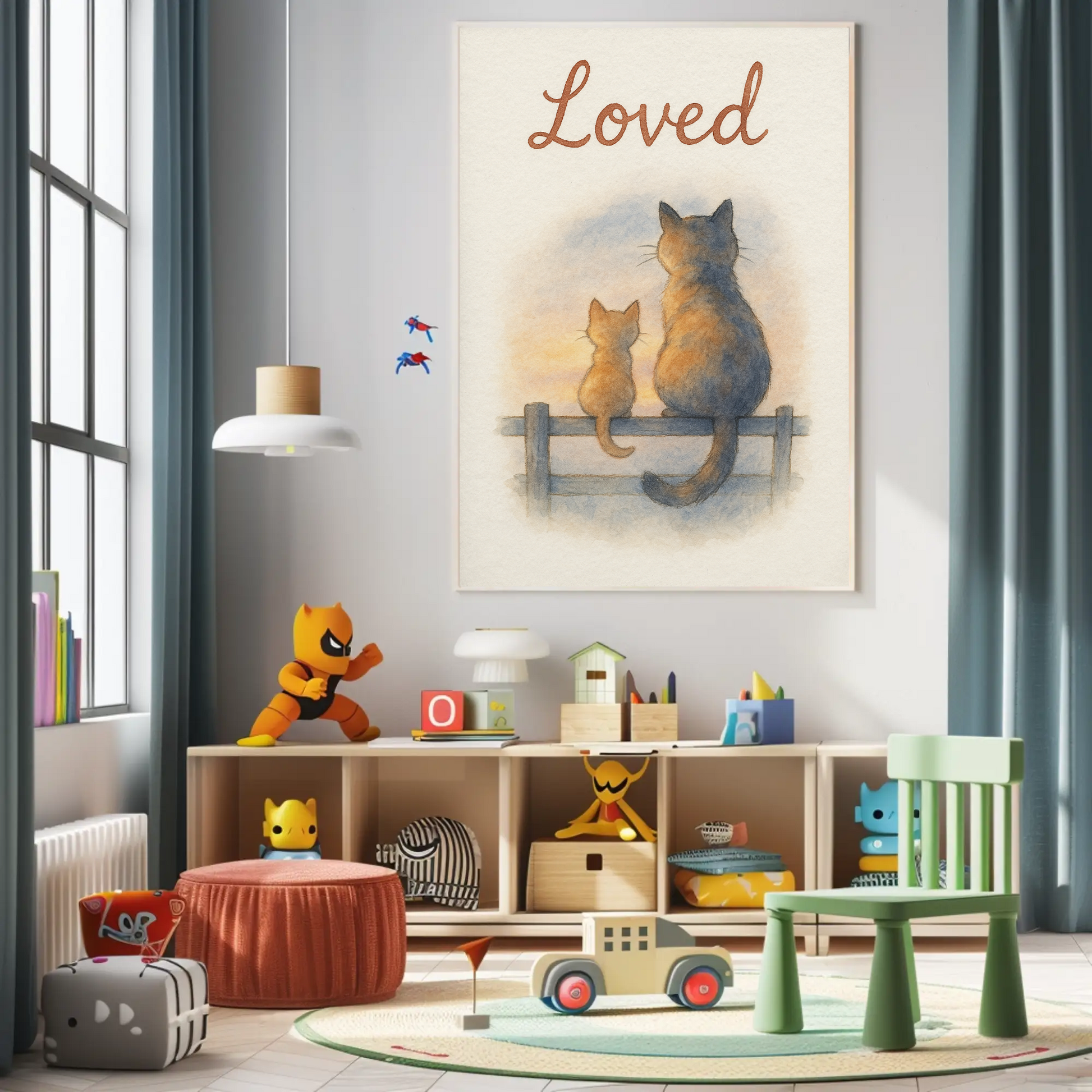 Loved Cat & Kitten Sitting On A Fence Nursery Children's Room Wall Decor Print