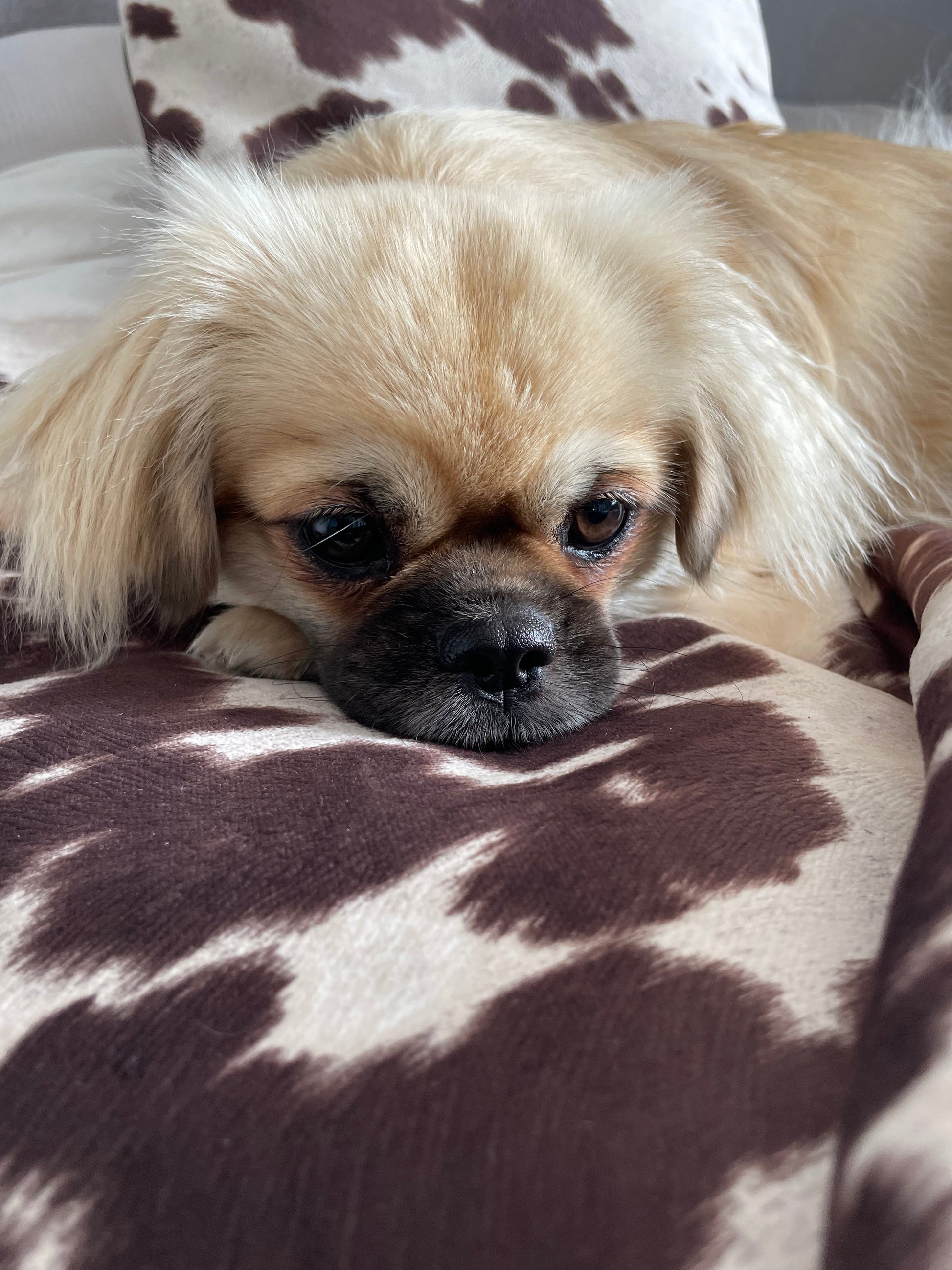 Handcrafted luxury pet bed featuring reversible design with striking faux textured cow hide on one side and rich brown faux leather on the other. Part of The Moody Cow Collection, this dual-sided daybed offers versatility to suit your décor. The removable cover features a generous zip and is hand washable for convenient maintenance. Expertly constructed for durability and comfort, it's an elevated choice for discerning pet owners seeking both style and practicality.