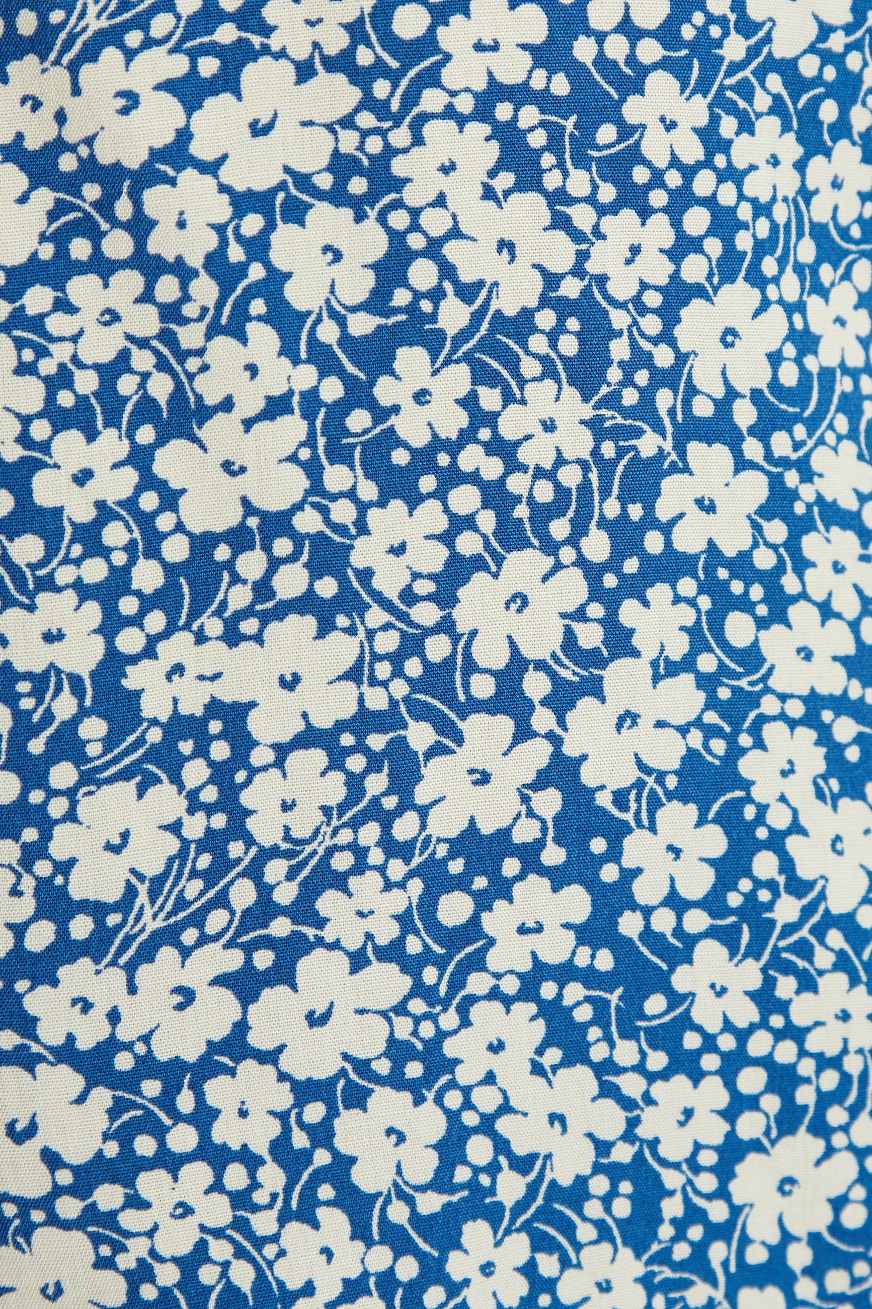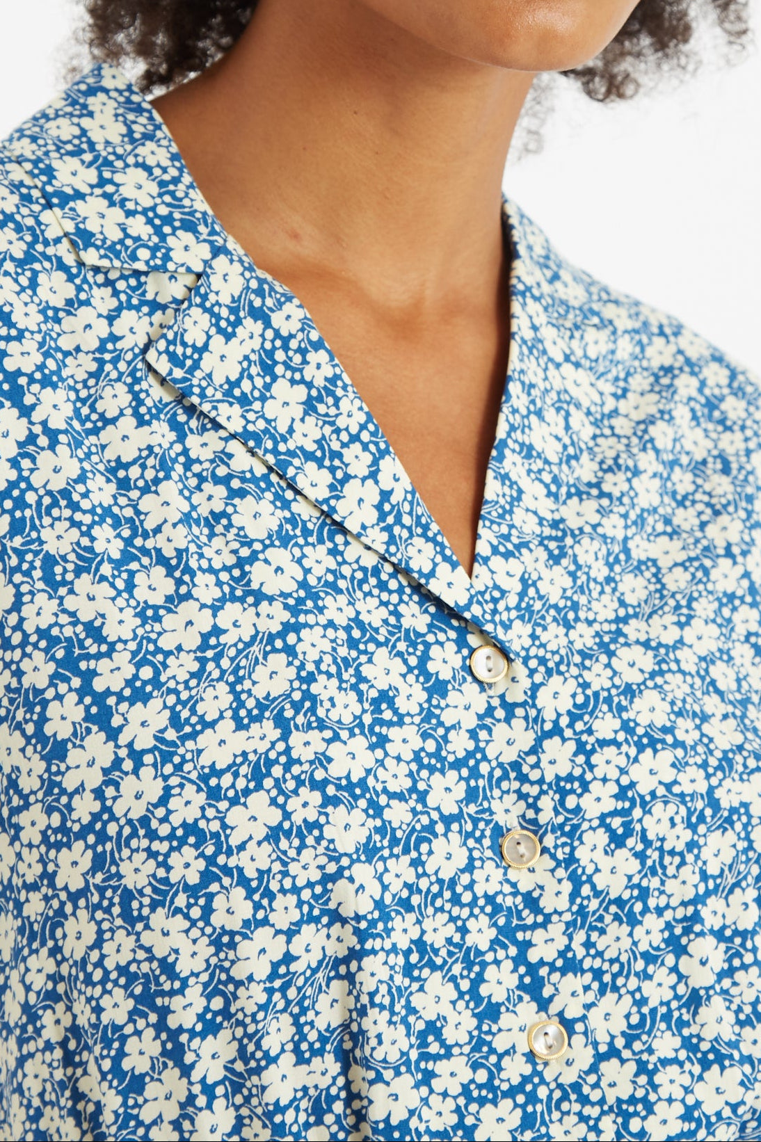 Mafalda is the most perfect, relaxed fit jumpsuit ideal for summer strolls and picnics. Crafted in a cool blue ditsy print. Featuring a revere collar, button down front, self belt and cropped length trouser.