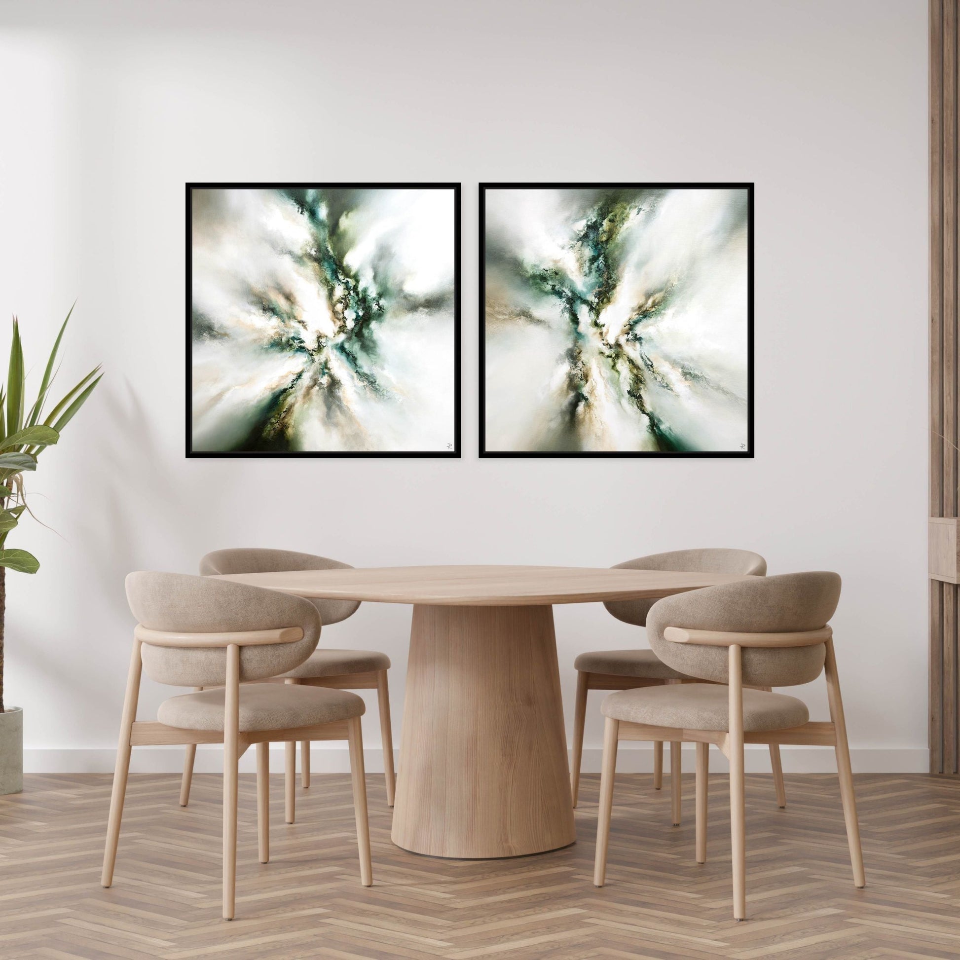 'Majestic I' and 'Majestic II' by Chris and Steve Rocks are abstract pieces with a dynamic composition. Forest greens, umbers and greys give a sense of style and sophistication to these inspirational works of art.