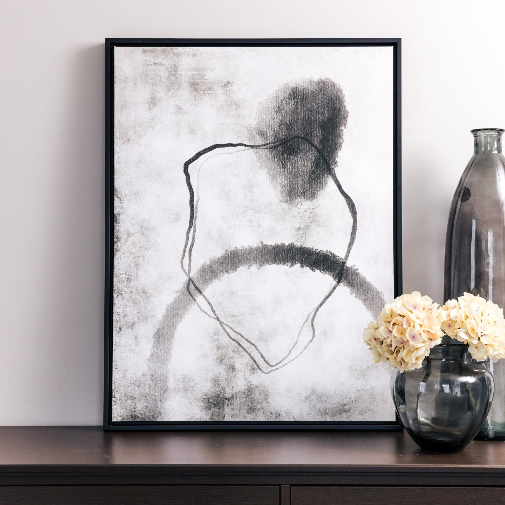 Embrace the ambiguity of ‘Novu’ as it adds a touch of artistic sophistication and mystique to your space. Minimalist in its nature, with a background of soft greys and white overlaid with charcoal coloured circular abstract forms, makes for a striking statement piece.