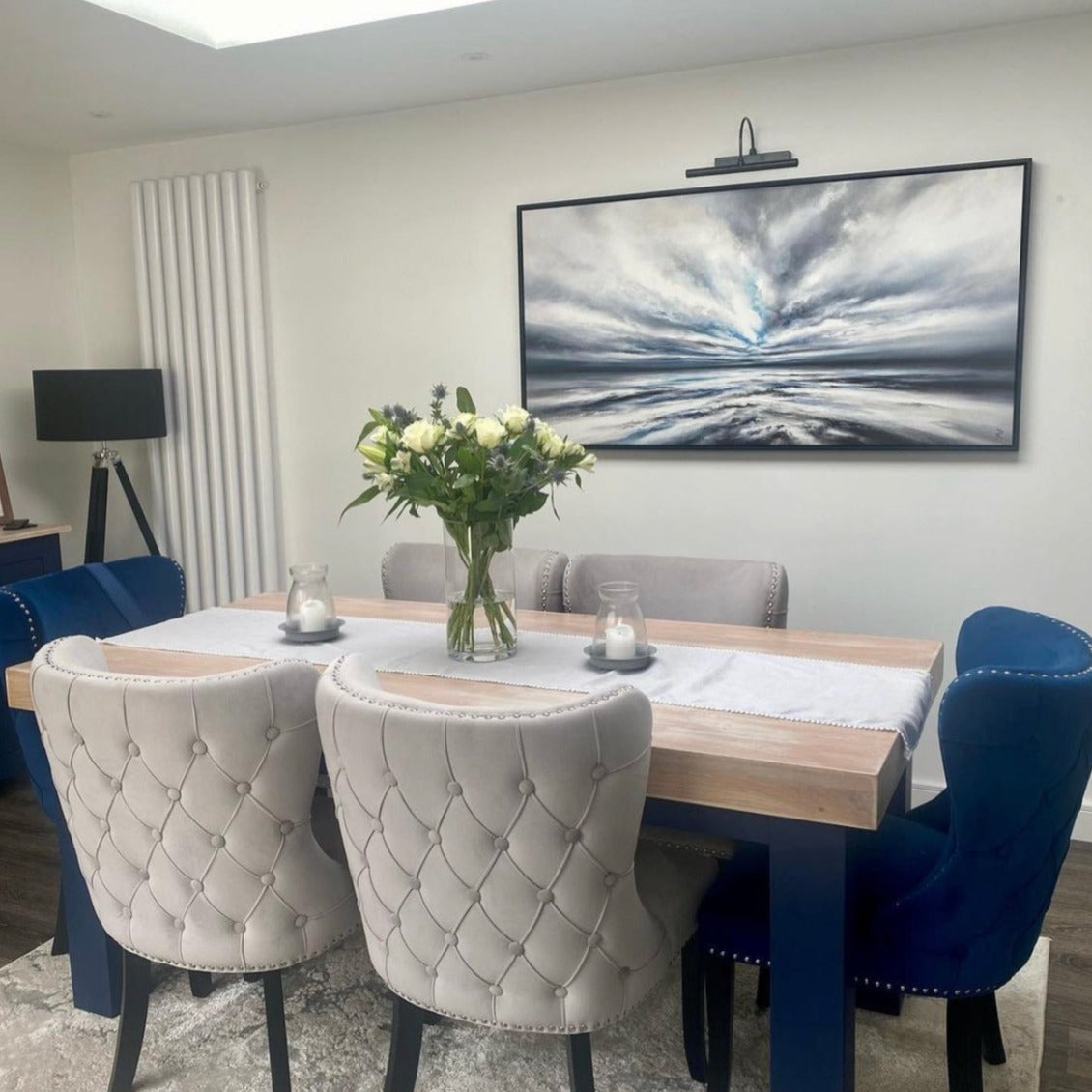 A calming, yet impactful coastal vista by Chris and Steve Rocks. ‘Serenity’ brings sophistication to your space. The soothing blues contrast with moody greys to create a tranquil atmosphere.