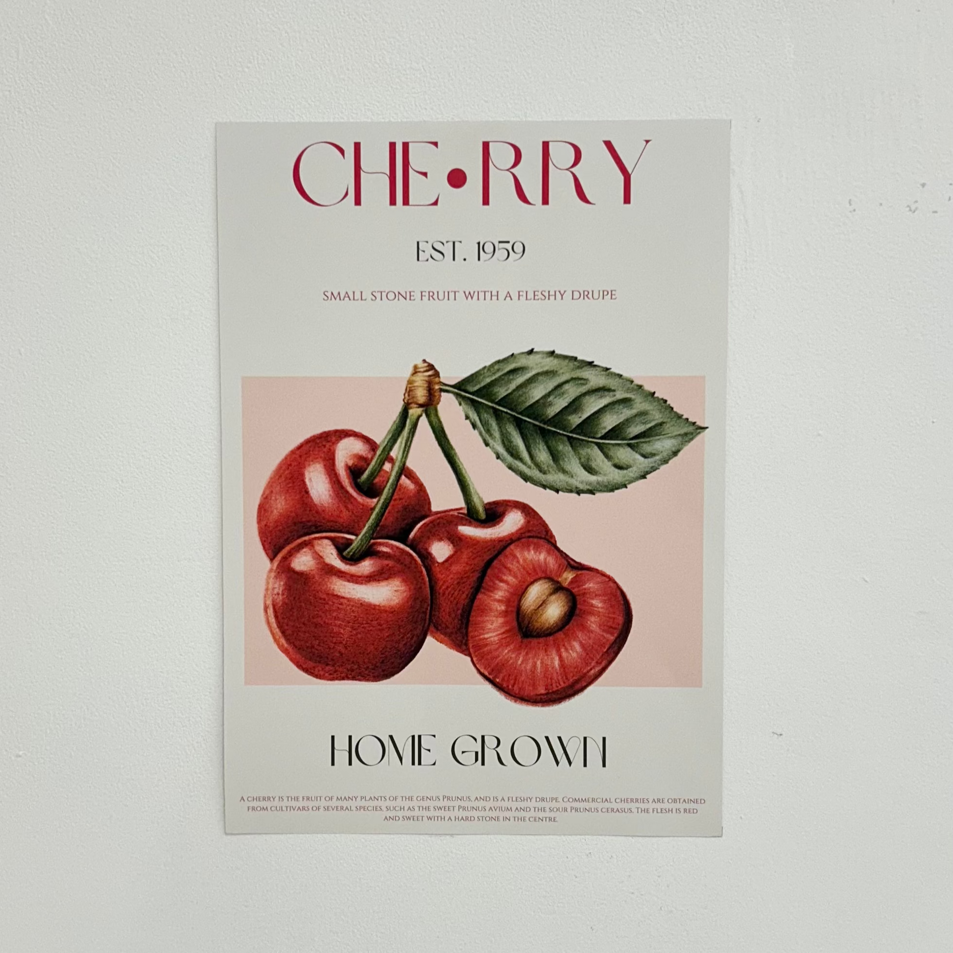 This charming print gives sweet cherries a fresh twist through a vintage-inspired lens. Rich shades of red add depth and warmth, while the clean composition keeps things effortlessly elegant. With a nod to nostalgic design and a touch of modern flair, this piece turns a simple fruit into something artful and unexpected.