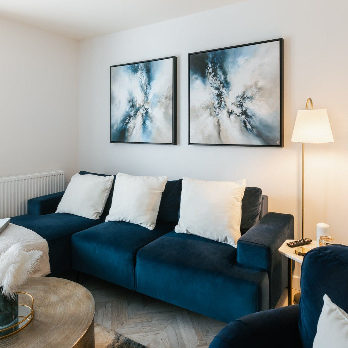 ‘Unbound I and Unbound II’ by Chris and Steve Rocks, a set of dramatic abstract work that draws immediate attention and quickly becomes a talking point of your room. The midnight blue hues contrast perfectly with the white and beige tones.