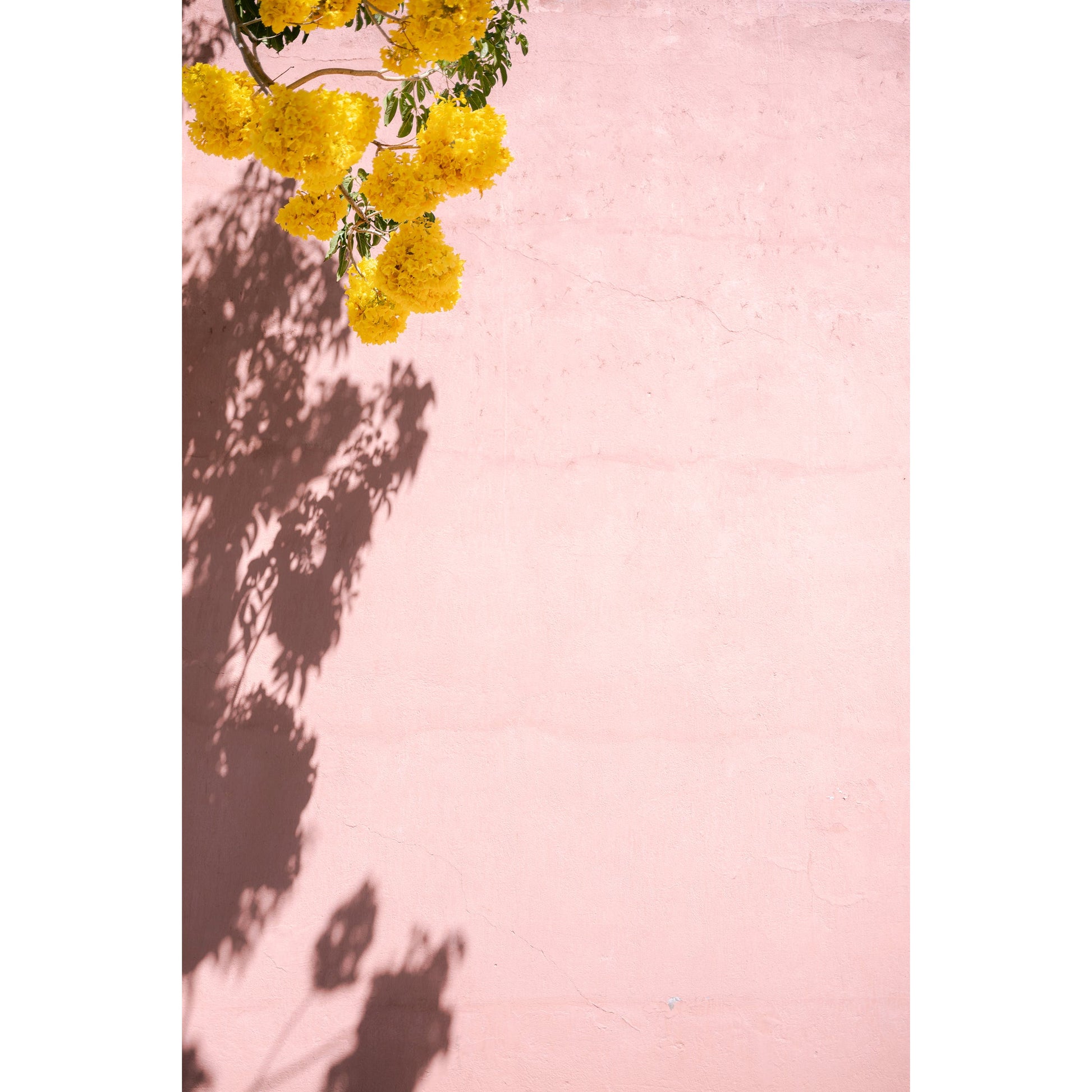 This refined photograph captures a vibrant conversation between bright yellow blooms and a soft pink wall in Oaxaca. Through a masterful dance of reflection and shadow at golden hour, it reveals subtle shifts in colour and celebrates Mexican architectural traditions.