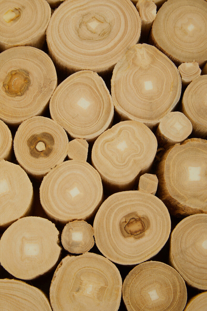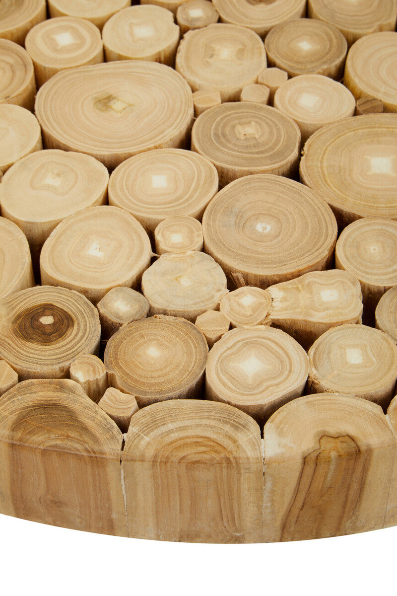 This table features cutout teakwood branch pieces which are neatly interlinked to create a round top. The top has a natural textured finish which contrasts with a matt black iron frame that will complement any living space in your home.