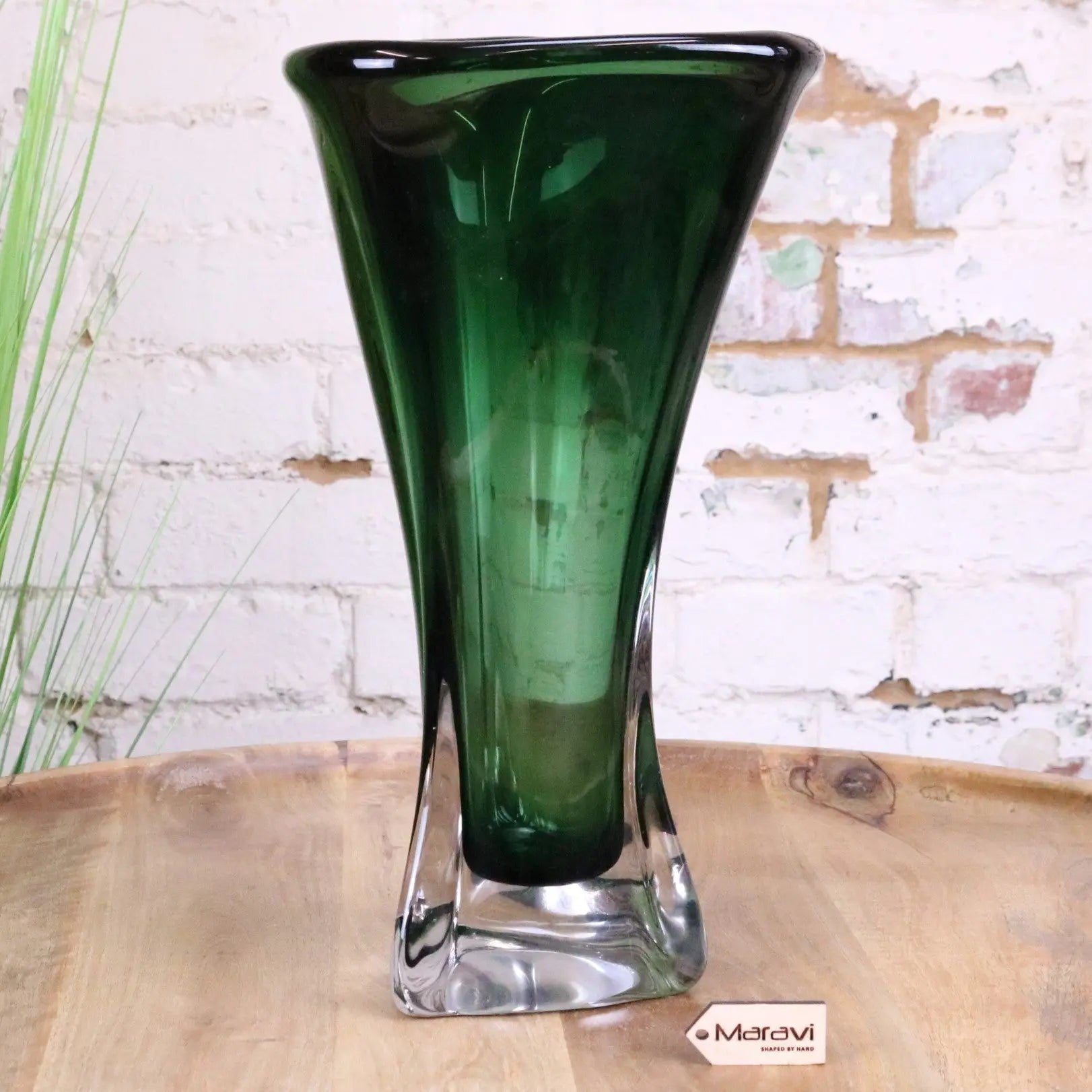 Elevate your home décor with the Kesira Luxury Tall Green Glass Vase—a striking piece that combines rich colour, graceful curves, and sculptural form. Crafted from thick, high-quality glass, this tall green glass vase features a deep emerald green hue that intensifies as it flows toward the base, where it meets a crystal-clear sculpted foundation. The result is a visually arresting gradient that catches and plays with the light beautifully throughout the day.