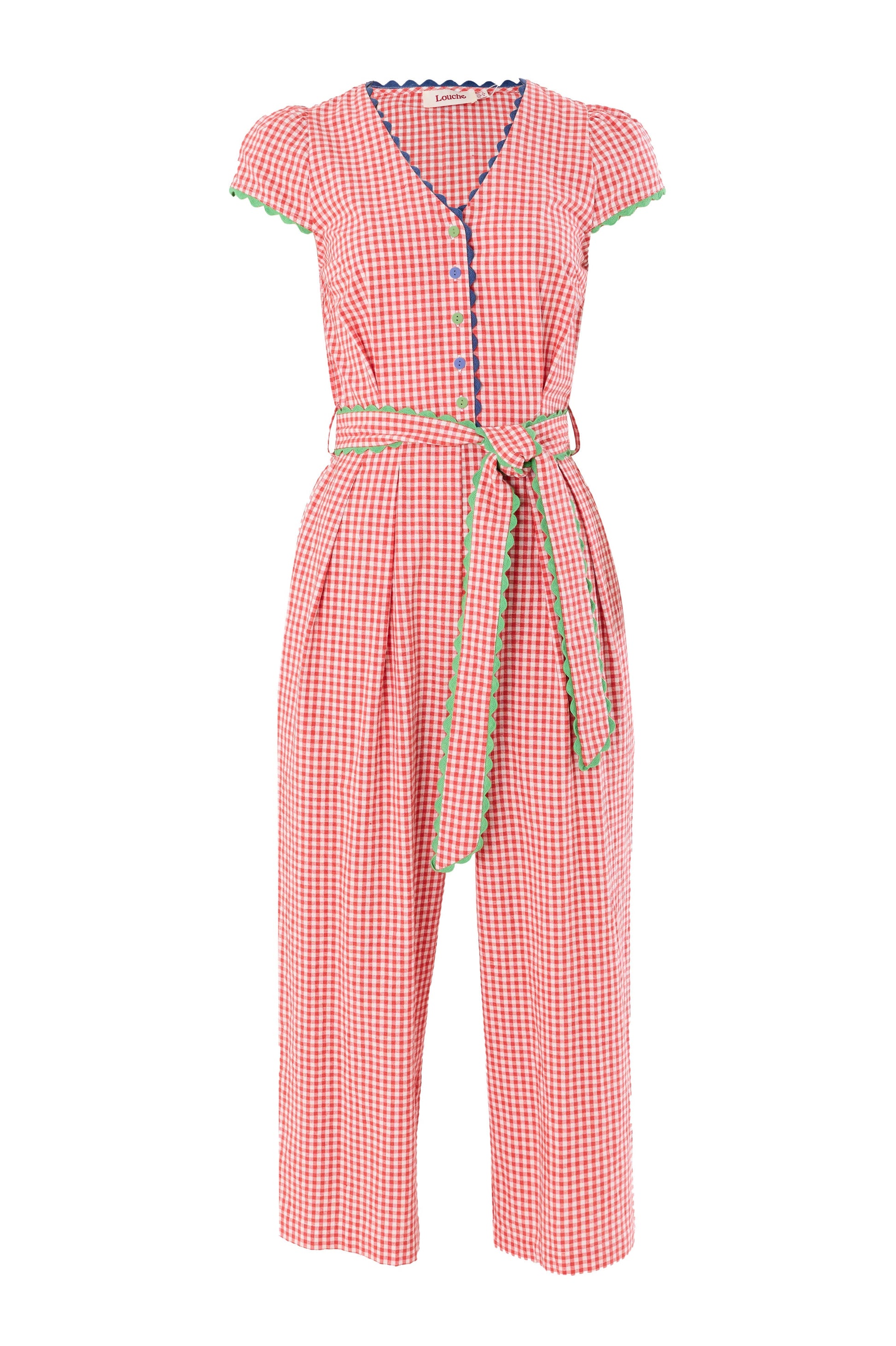 Get summer ready with the Marleen gingham ric rac trim cropped jumpsuit. This playful piece features a flattering v-neckline, cap sleeves, and a self tie belt, all trimmed with colourful ric rac.