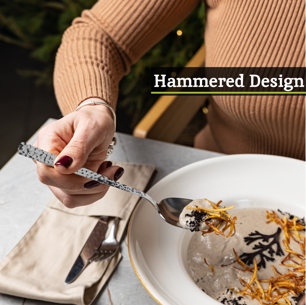The Martello cutlery set adds textured glamour to the dining table. This 16 piece set serves four, perfect for medium sized dinner parties. Each stainless steel piece features hammered handles that glint under the light.