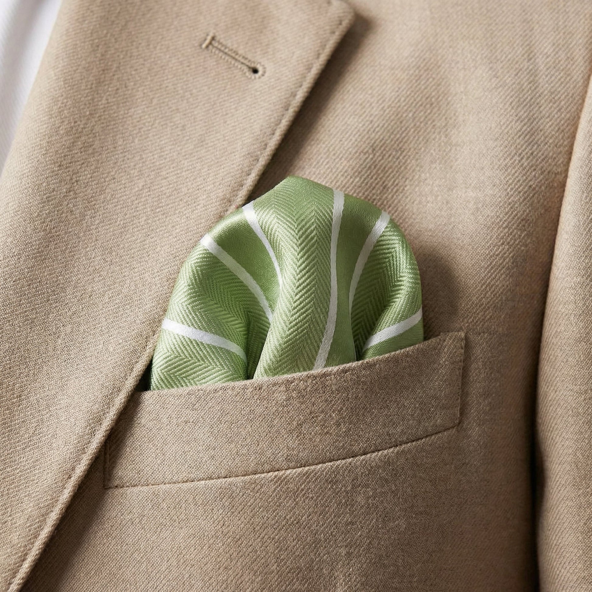 This matcha green herringbone pocket square with white double stripes offers a fresh yet sophisticated touch.