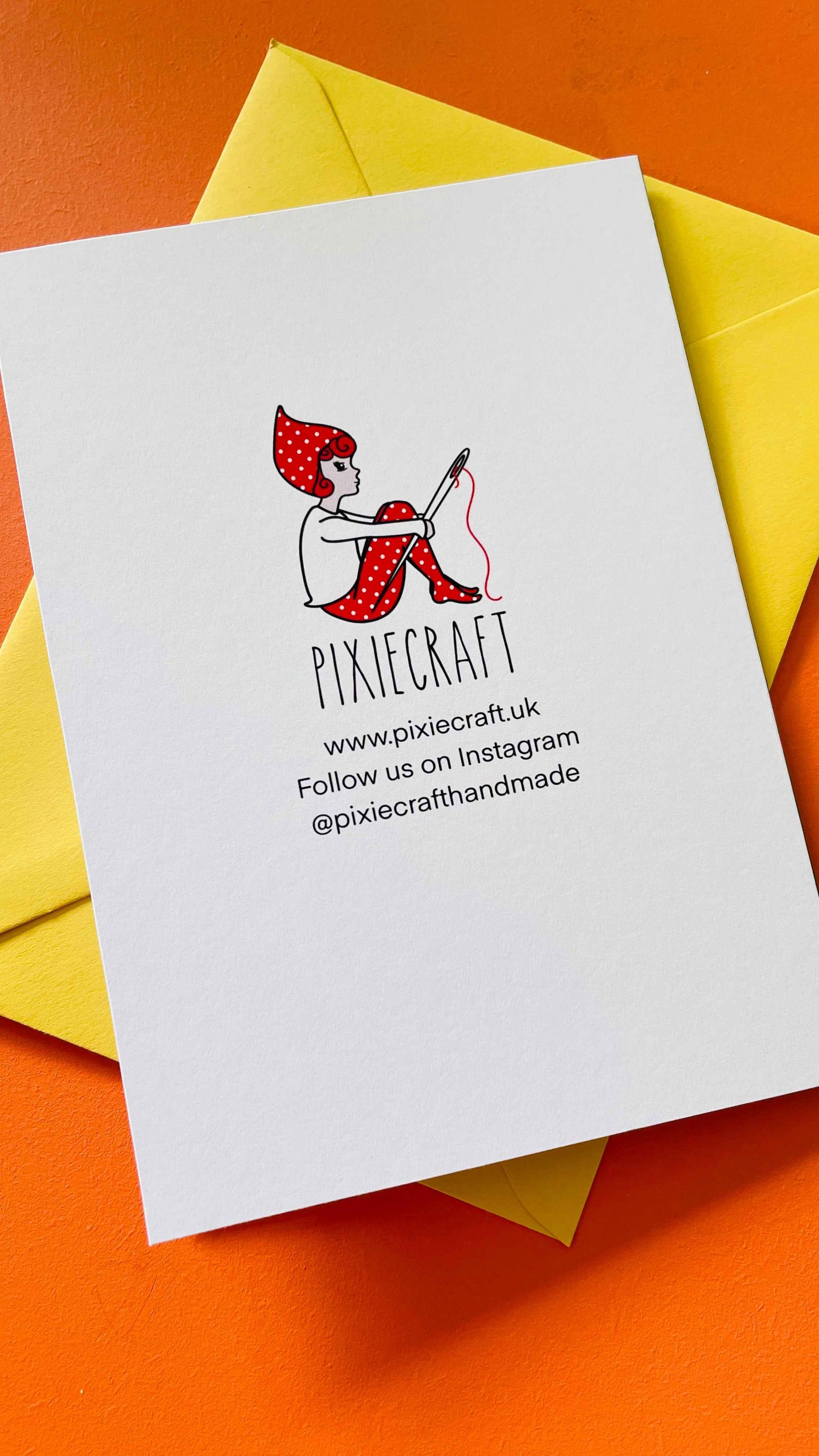 This original illustration from Pixiecraft this card is blank on the inside for your message and is approx A6. Comes with a co-ordinating colourful envelope made from recycled paper.