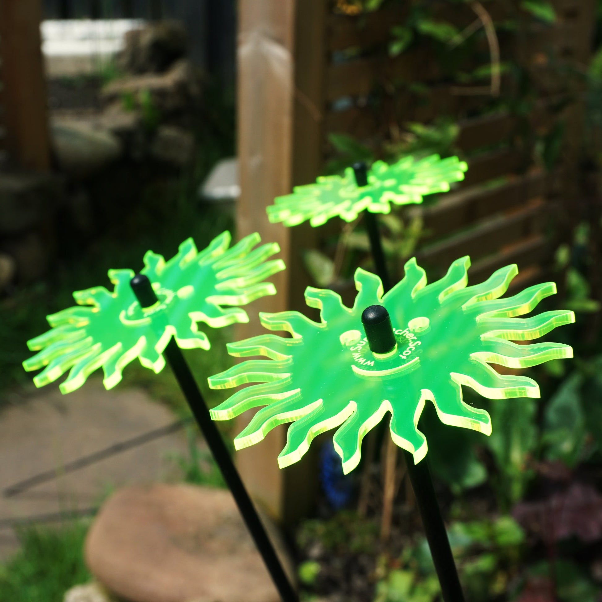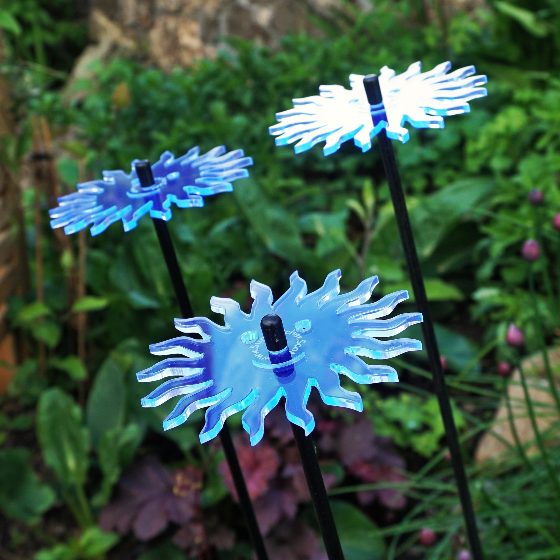 This Set of 3 SunCatchers 'Smiling Sun' consists of:- three wide, glowing light collector in red, orange, yellow, green or blue- three 50cm long, black swing rod,- matching support rings and end caps.Planted it is about 45cm high and looks great in your flower bed or pot.