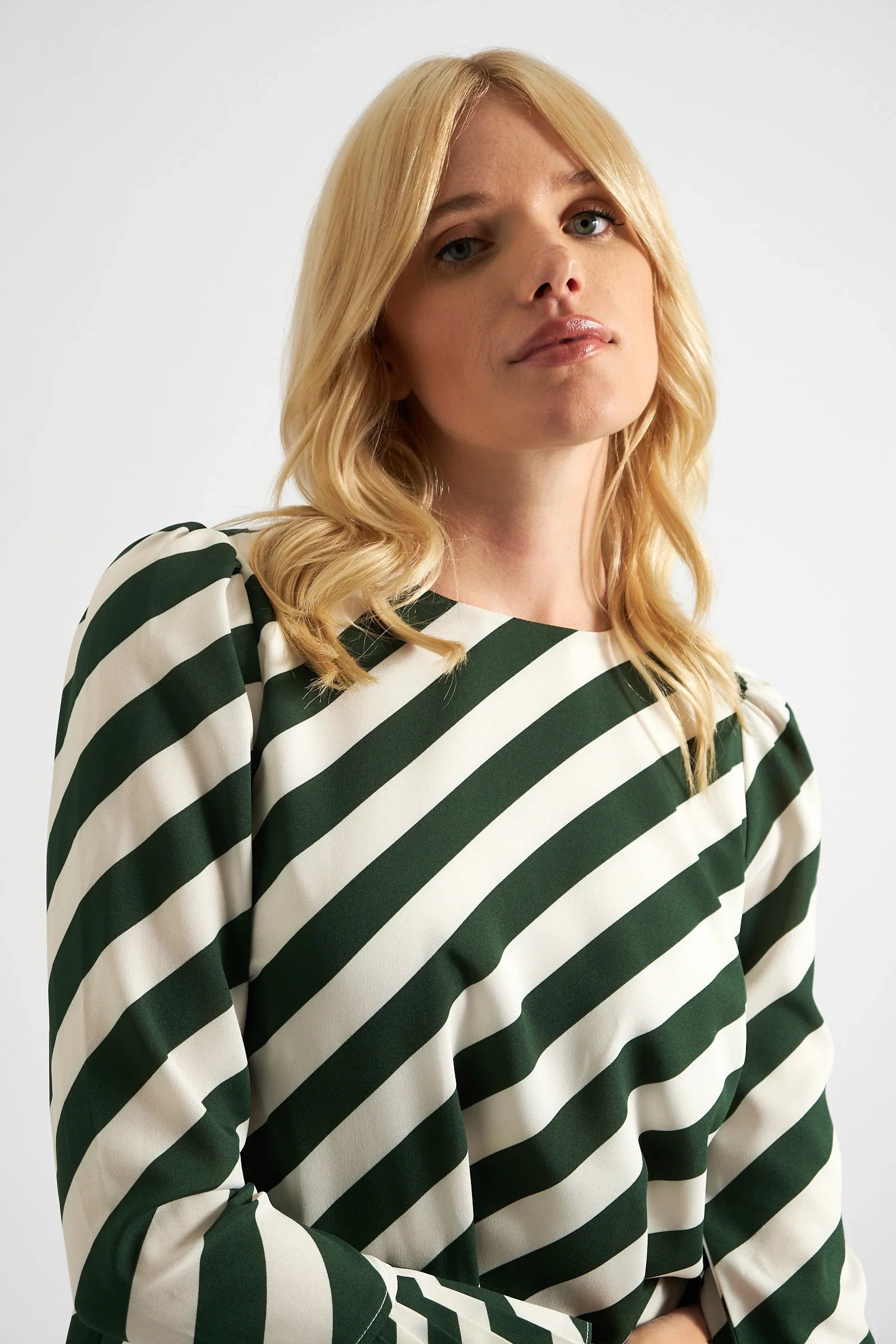 "Stand out with 60's retro-inspired style in the Megann Diagonal Lines mini dress. The bold green and white stripe makes a statement, while playful pleated cuffs and side seam pockets add a touch of quirky fun. Perfect for adding some excitement to your wardrobe."