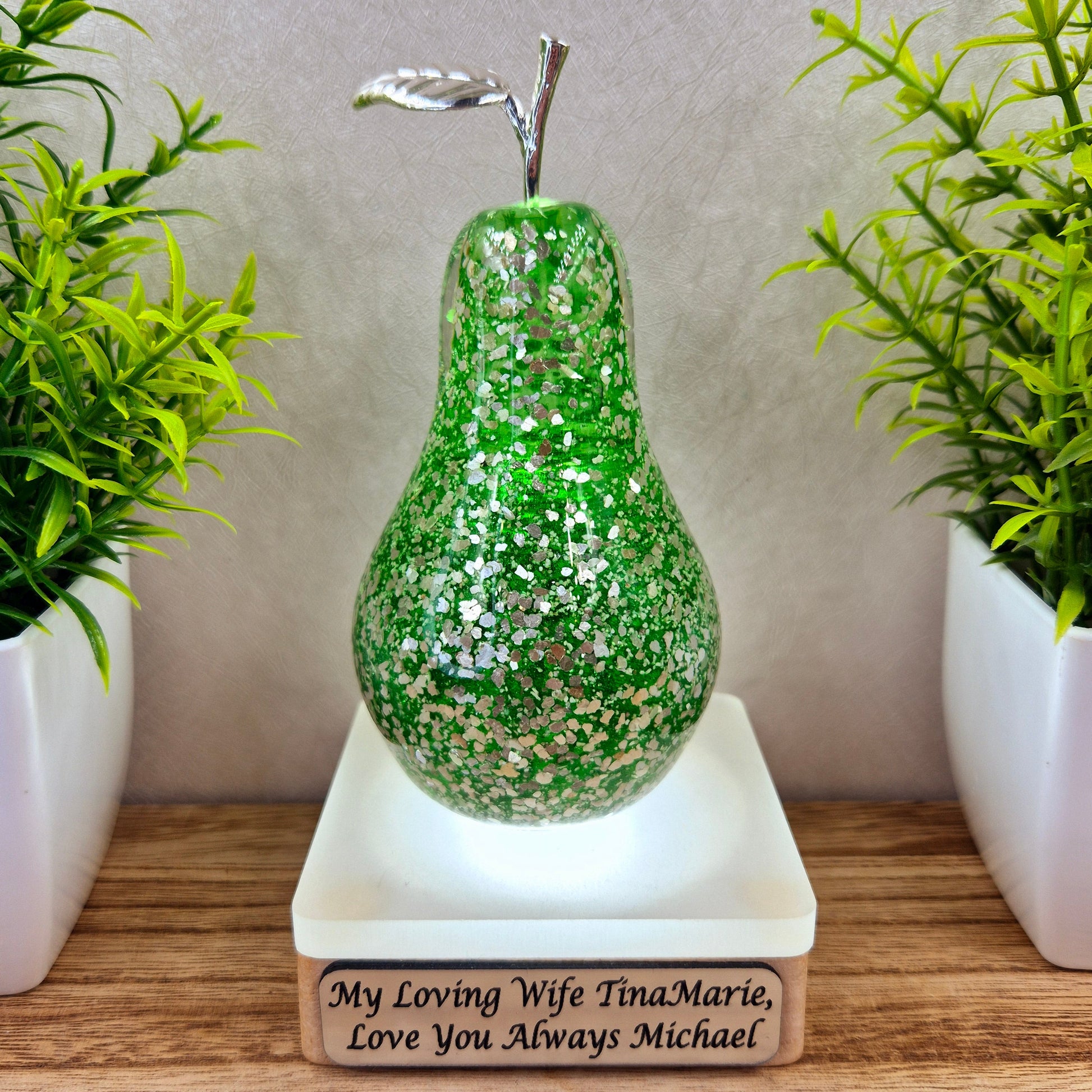 This handcrafted glass apple or pear serves as a heartfelt memorial keepsake, infused with the cremation ashes of a loved one or pet. Offered in a variety of vibrant colours, each piece is carefully made to preserve cherished memories.