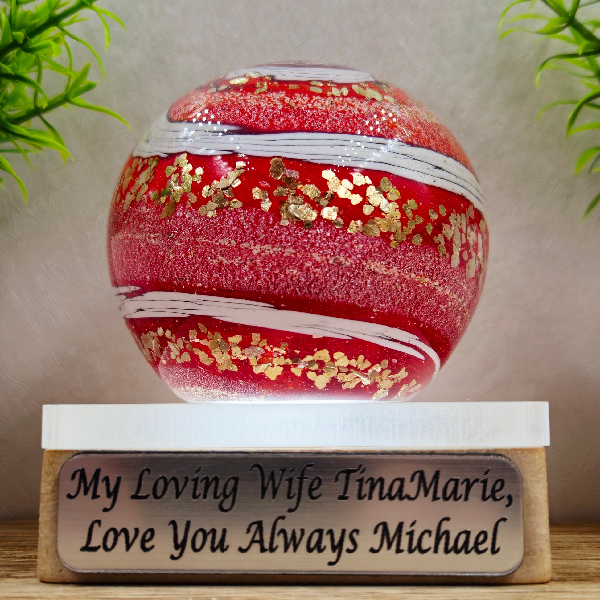 Honour a loved one's memory with this handmade memorial glass orb paperweight, beautifully infused with cremation ashes and crafted with care. Complete with an optional engraved display stand, this timeless keepsake serves as a heartfelt tribute to cherish forever.