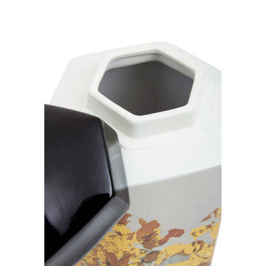 The Mera Large Jar by Orsina is a hexagonal ceramic jar that showcases oriental-style golden artwork over a glazed field, completed by a removable black lid. Orsina's mix of geometry and fine linework gives the ceramic jar a balanced presence in living rooms and dining spaces.