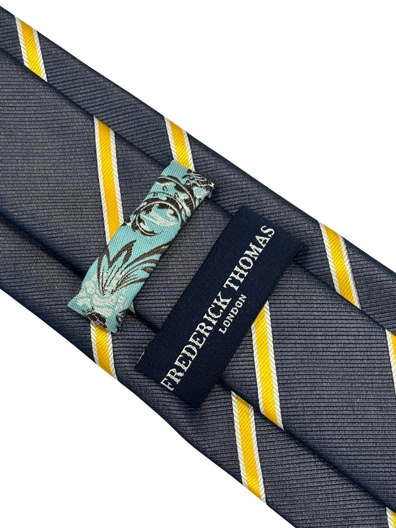 Frederick Thomas handmade midnight grey blue tie with yellow and fine white club stripe and signature floral design to the rear.