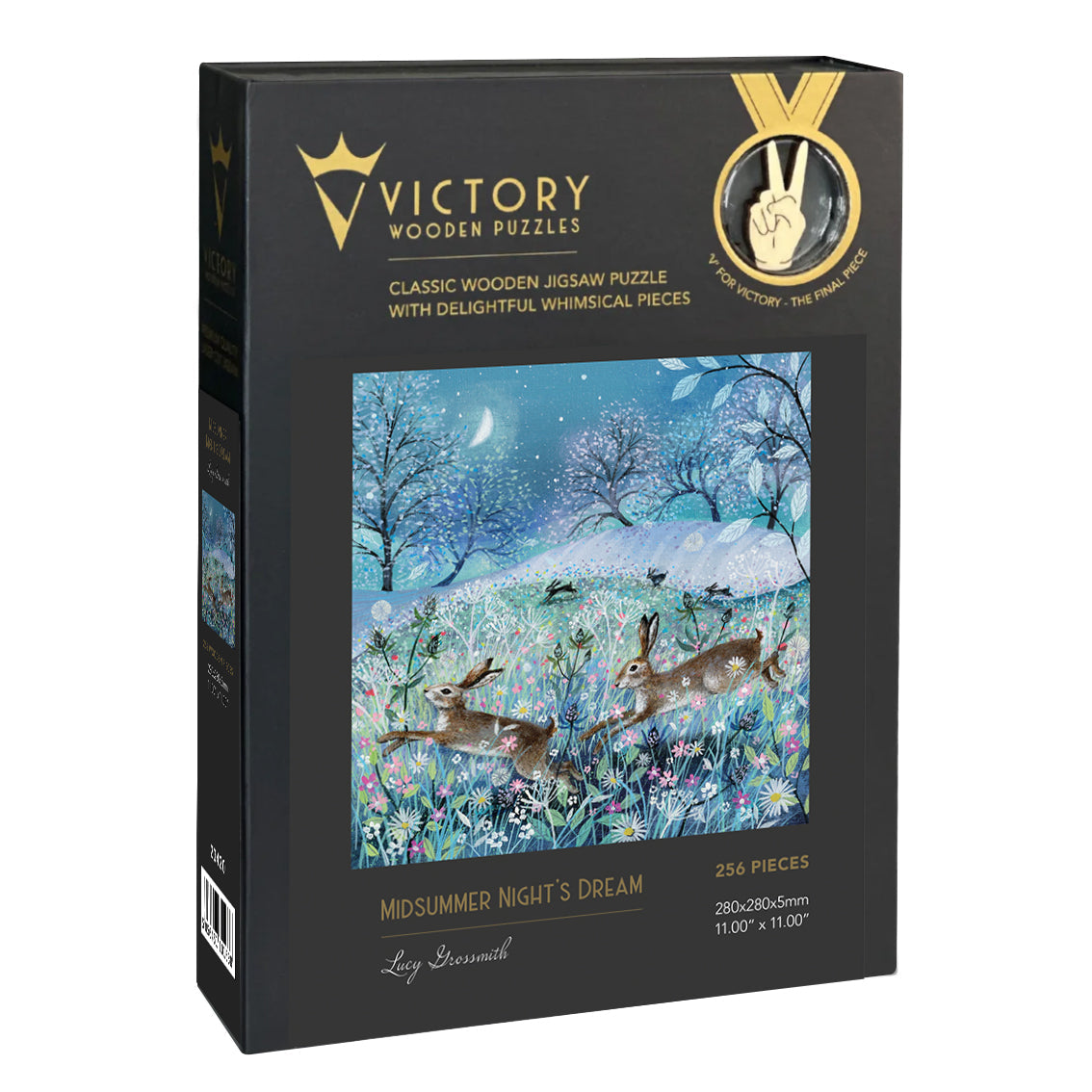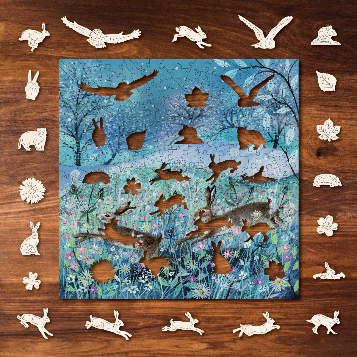 Embark on a whimsical journey with the Midsummer Night's Dream wooden jigsaw. This exquisite puzzle boasts 256 irregularly shaped pieces that interlock perfectly, showcasing hares leaping through a moonlit field of vibrant wildflowers. Crafted from high-quality 5mm Linden plywood, this enchanting puzzle is perfect for both beginners and seasoned puzzlers alike. Immerse yourself in the magic of a moonlit evening as you piece together this captivating scene.