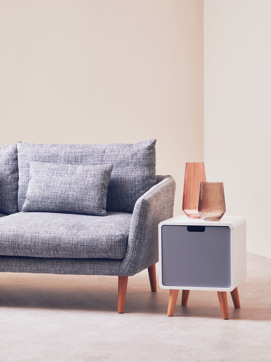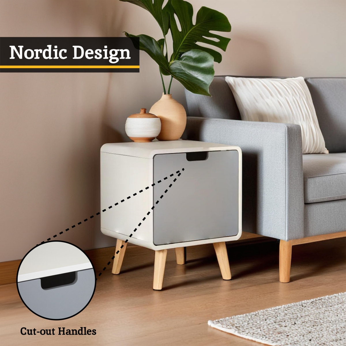 The Milo one-drawer storage cabinet in a light two-tonal finish features a Nordic-inspired look. This cabinet has one drawer with a cut-out handle that adds a touch of sophistication to its design. The natural-finish wooden legs offer stability to its storage frame, making it a standout addition in the living room. Pair it with a living room coffee table to create a coordinated look.