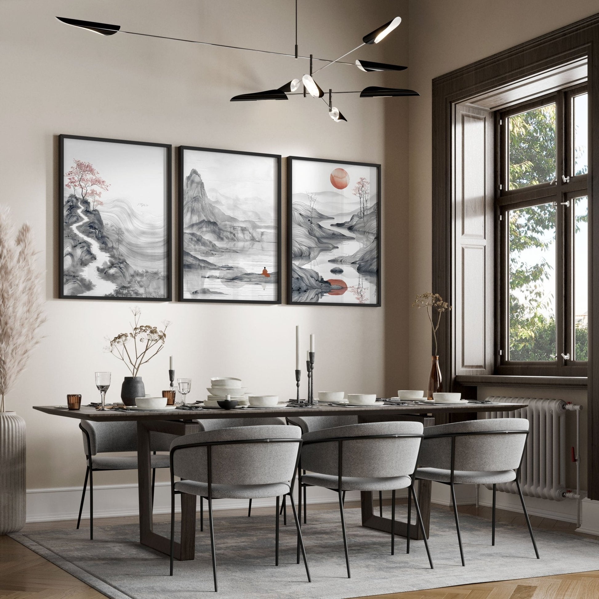 Transform your space with our exquisite Modern Living Room Art | Set of 3 Asian Inspired Wall art Prints. These stunning artworks effortlessly bring a touch of sophistication and serenity to your living space. The black and white gallery colour palette creates a modern aesthetic while the Asian-inspired design offers a calming vibe. Imagine the tranquillity of an eastern landscape capturing hearts in your home. Let these prints serve as conversation starters and focal points, drawing admiration from all who visit.